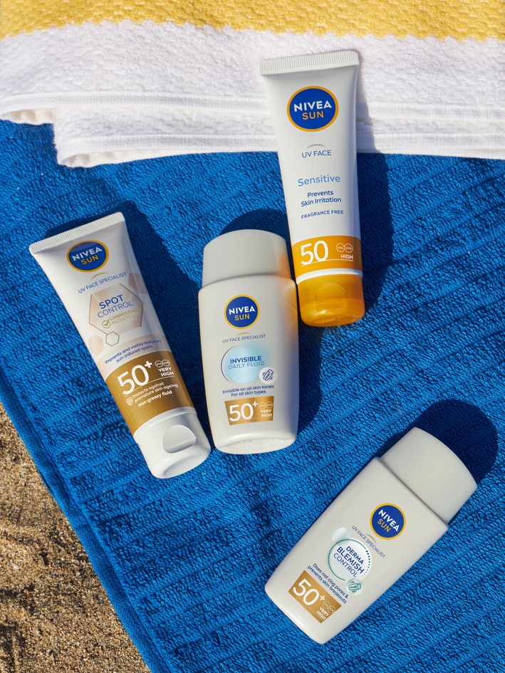 NIVEA SUN UV Face Specialist Dark Spot Control Fluid auttaa ehkäisemään ja vähentämään näkyvästi auringon aiheuttamia läiskiä suojaamalla herkkää kasvojen ihoa UV-säteiltä. Kevyt ja rasvaton fluidi sisältää Thiamidol®-aktiivin, hyaluronihapon ja E-vitamiinin, ja se tuntuu virkistävältä ja jättää sileän ihotunnun.