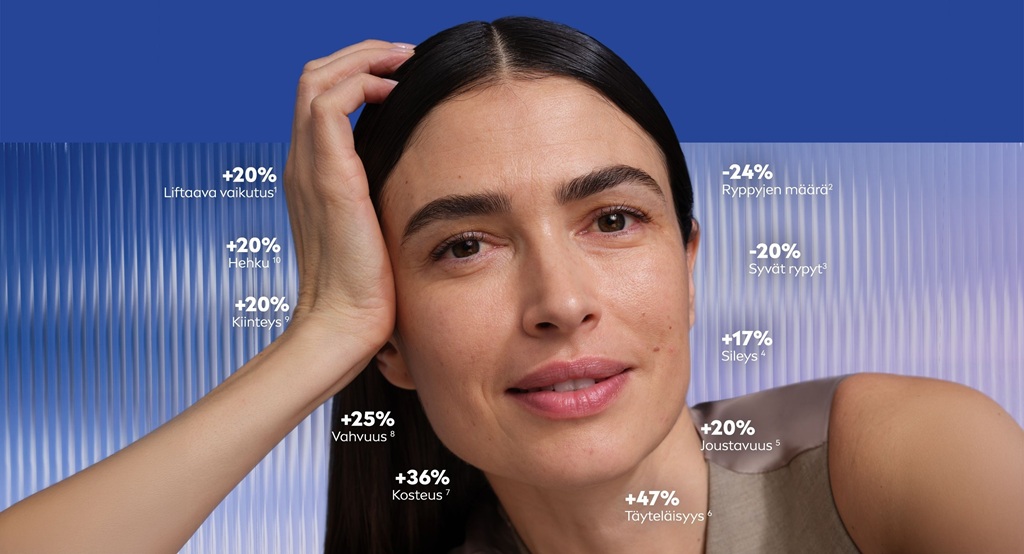 **Kliininen tutkimus 43 naisella, 2024. 98% osoitte merkkejä ihon nuorenemisesta (kiinteyden/joustavuuden paraneminen, liftaava vaikutus, ihon hehku)