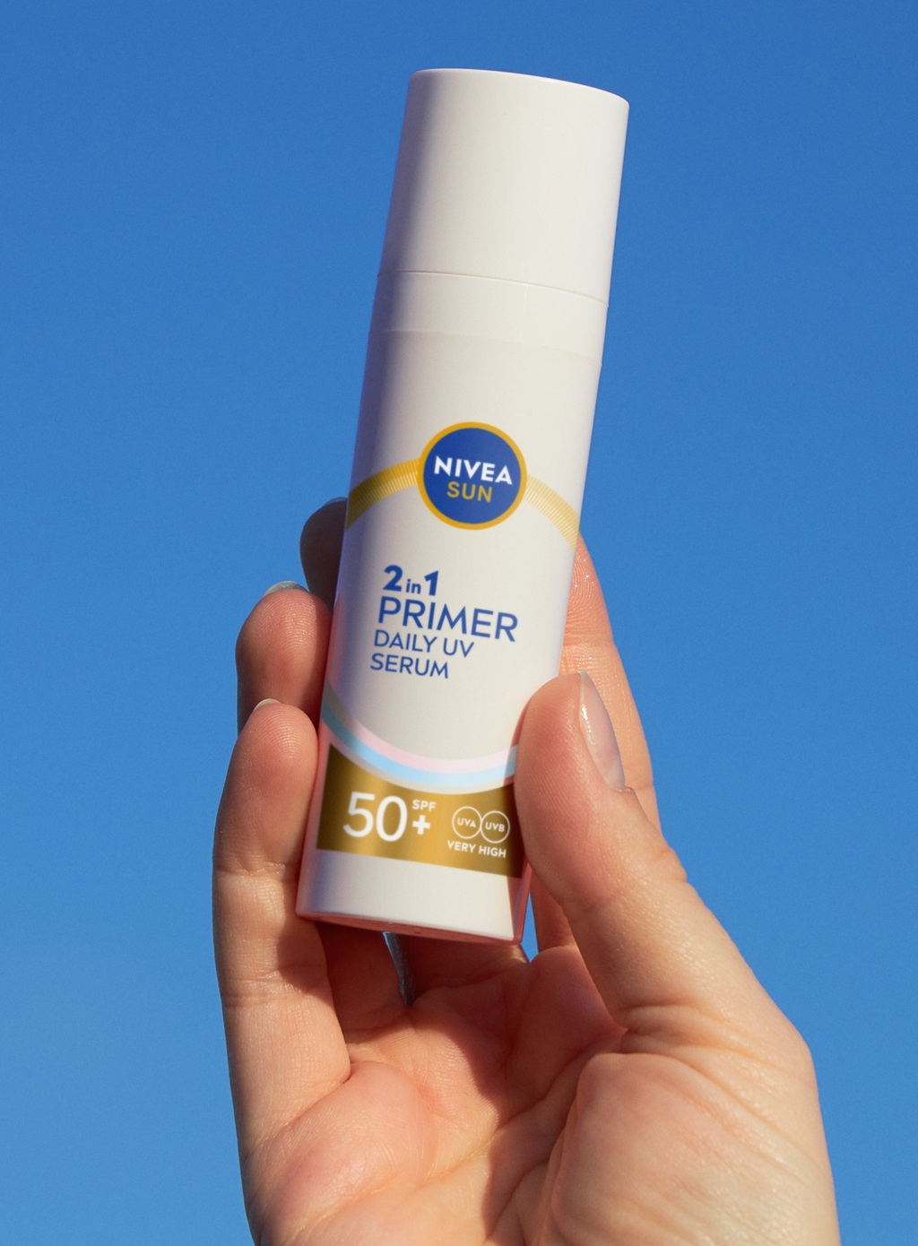 NIVEA 2in1 Primer Daily UV Serum SPF 50+ sisältää kevyen ja nopeasti imeytyvän koostumuksen, joka toimii sekä meikinpohjustusvoiteena että tehokkaana kasvojen aurinkovoiteena. Seerumi silottaa ihoa ja auttaa suojaamaan sitä auringon aiheuttamilta vaurioilta, kuten ennenaikaiselta ikääntymiseltä.