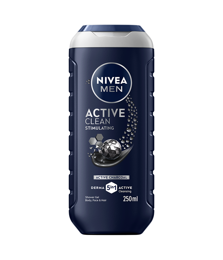 NIVEA MEN Active Clean Shower Gel -suihkugeelin innovatiivinen, luonnollista aktiivihiiltä sisältävä koostumus puhdistaa ihon perusteellisesti kuivattamatta sitä.