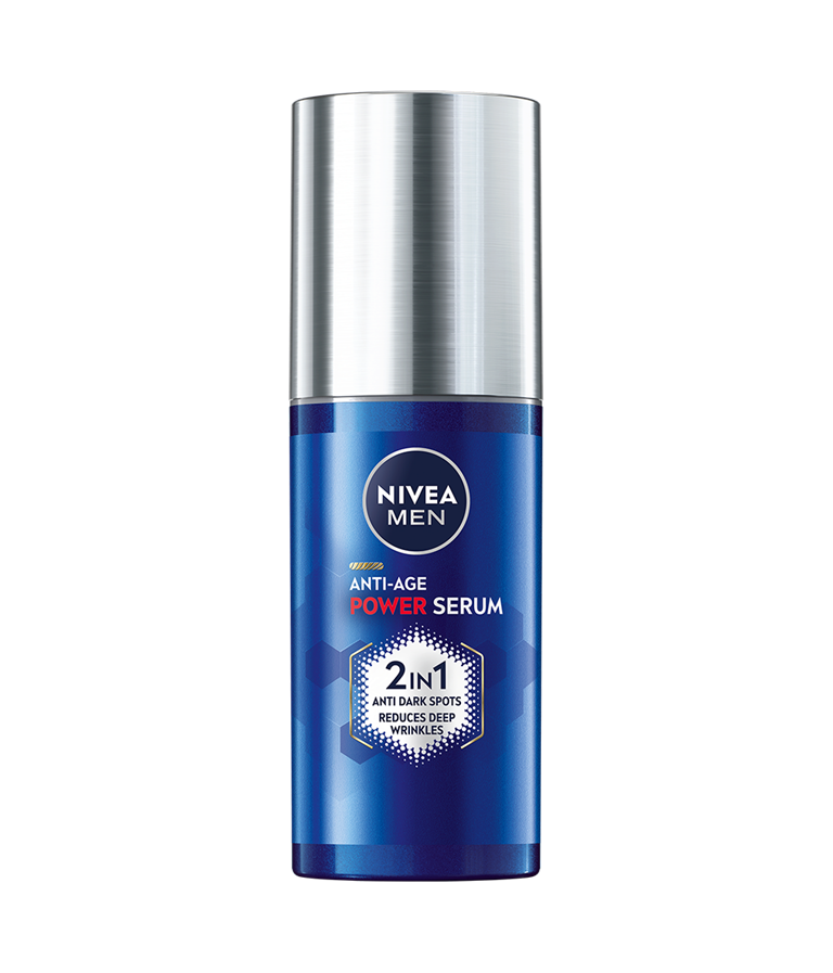 NIVEA MEN Anti-Age 2in1 Power Serum -kasvoseerumi yhdistää hyaluronihapon ja patentoidun pigmenttiläiskiä vähentävän ainesosan Luminous630n® tarjoten edistyksellisen pigmenttiläiskien vähenemisen ja anti-age-vaikutuksen iholle.