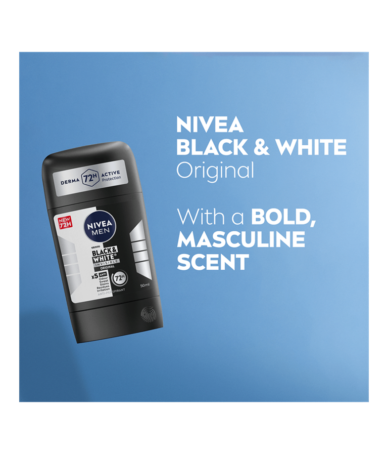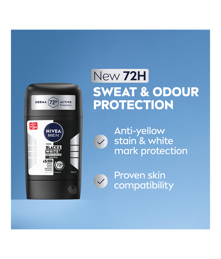 NIVEA MEN Black & White Invisible Original Deo Stick -antiperspirantti antaa tehokkaan ja luotettavan 72 tunnin antiperspiranttisuojan, joka hoitaa ihoa. Lisäksi se suojaa mustia vaatteita valkoisilta jäljiltä ja ehkäisee keltaisten tahrojen syntymistä valkoisiin vaatteisiin.