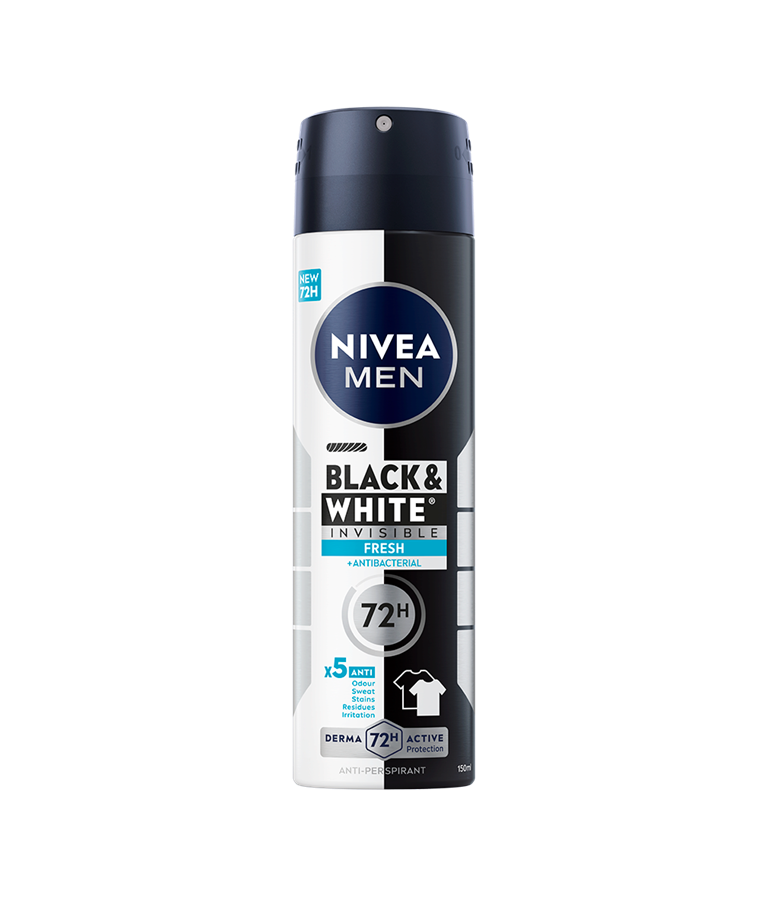 NIVEA MEN Black & White Invisible Fresh Deo Spray -antiperspirantti antaa 72 tunnin suojan hikoilua vastaan tahraamatta vaatteitasi.