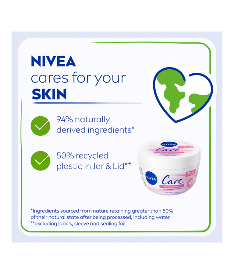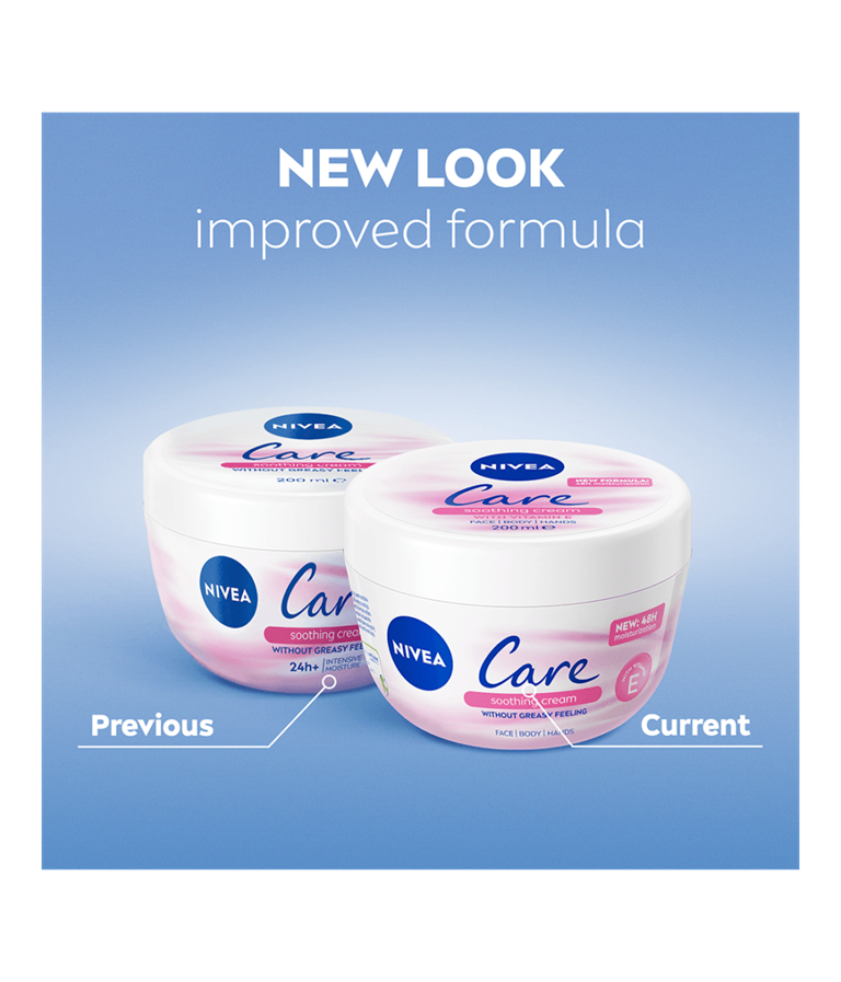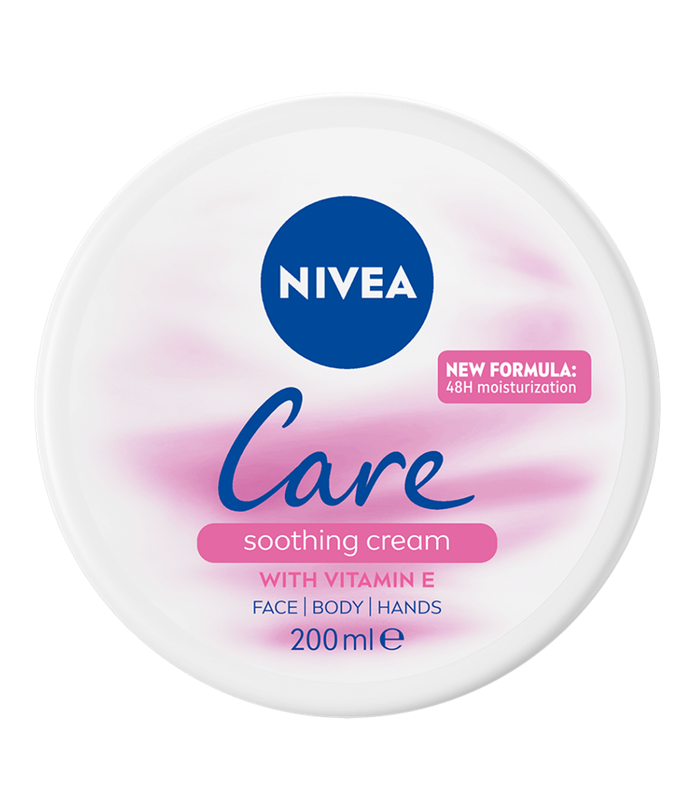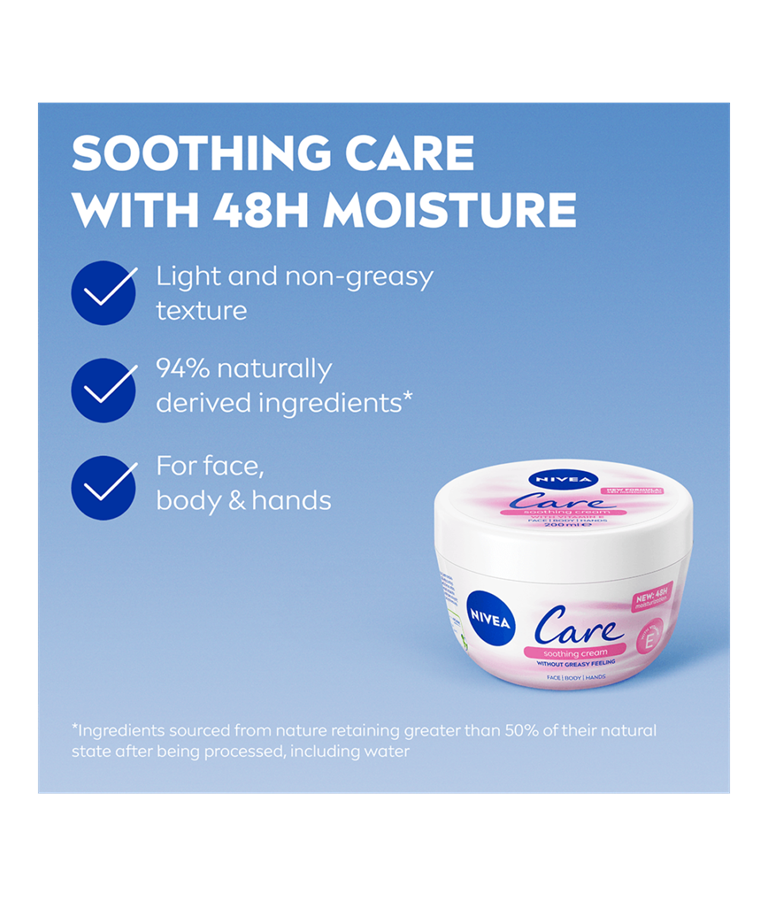 NIVEA Care Soothing Cream -kosteusvoide ravitsee ja kosteuttaa ihoa tehokkaasti. Kevyt koostumus ei jätä rasvaista tunnetta iholle.