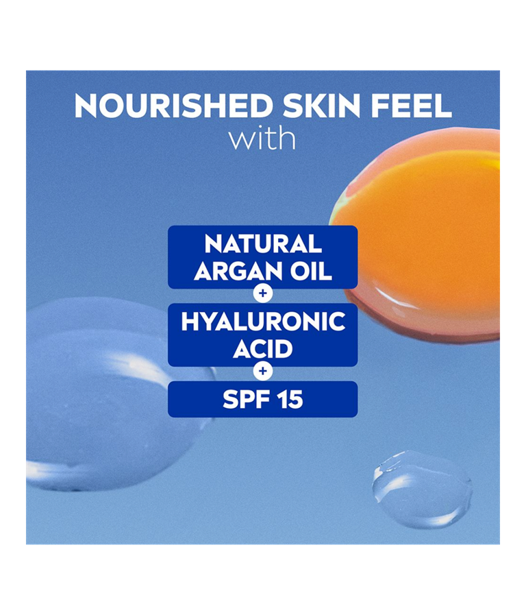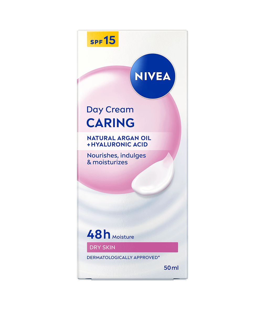 NIVEA Caring Day Cream SK 15 -päivävoiteen hyaluronihappoa ja luonnollista arganöljyä sisältävä koostumus kosteuttaa ja ravitsee ihoa tehokkaasti.