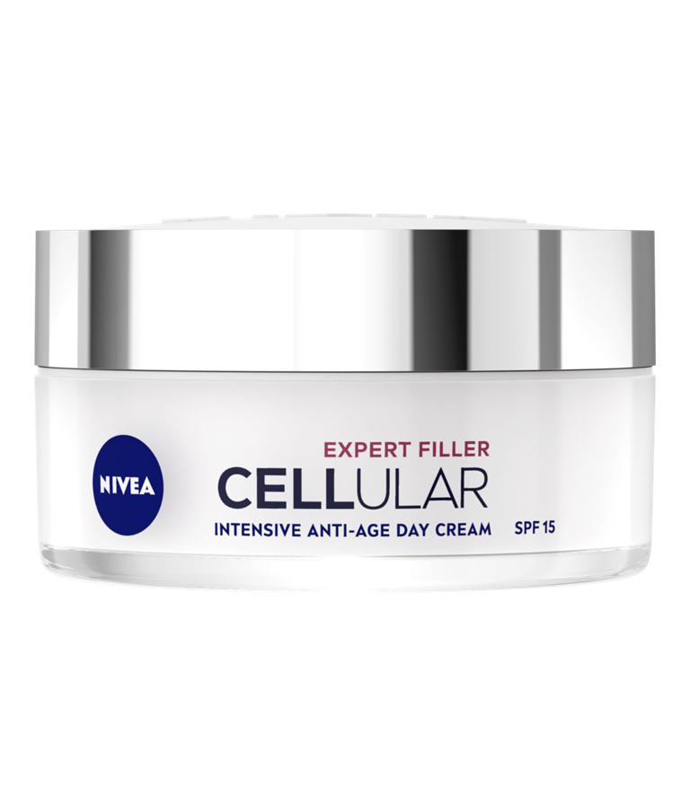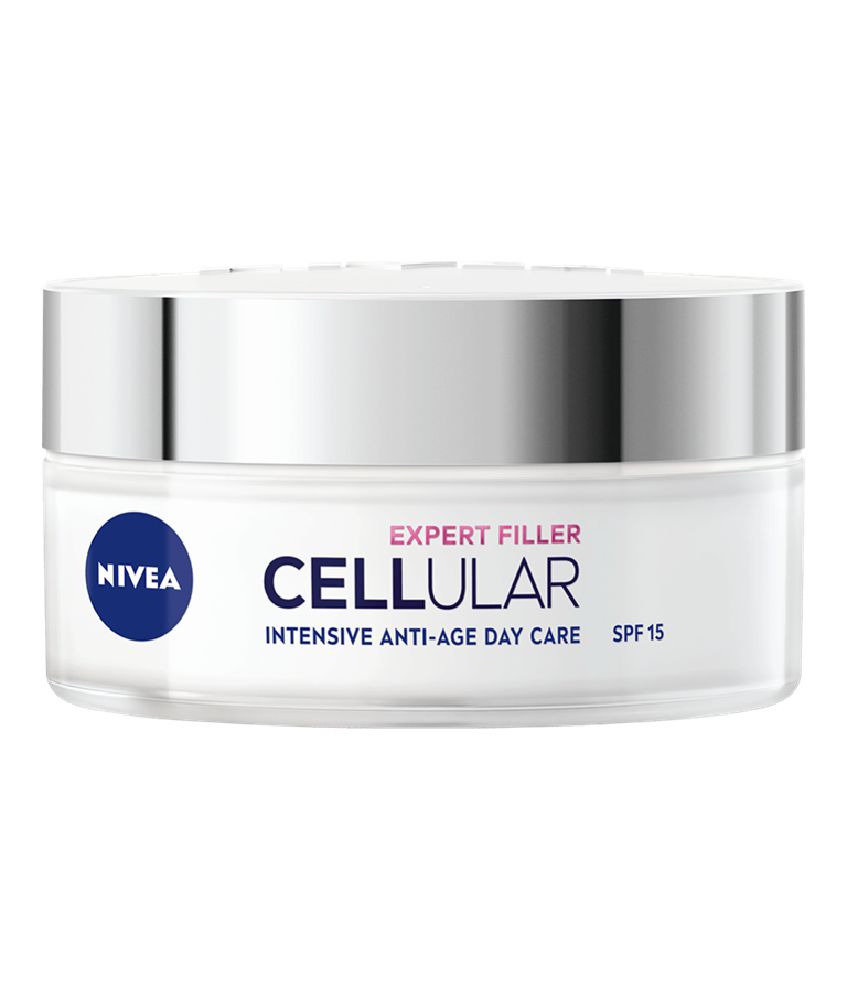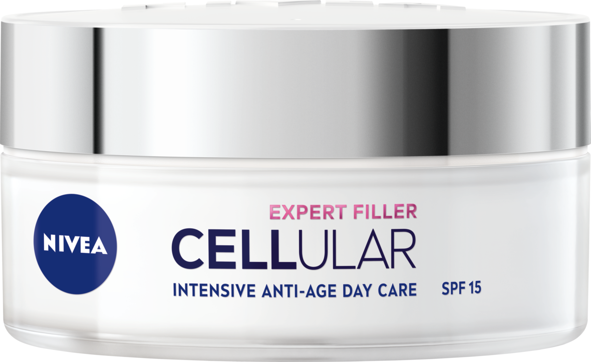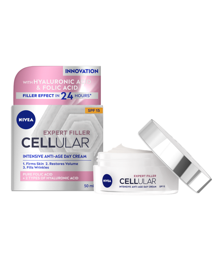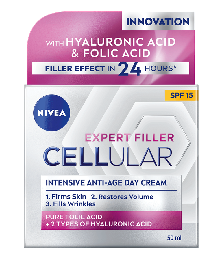 NIVEA Cellular Expert Filler Day Cream -päivävoide sisältää yhdistelmän tehokkaita anti-age-ainesosia, jotka antavat iholle ryppyjä täyttävän vaikutuksen 24 tunnissa* ja ehkäisevät kiinteyden ja volyymin menetystä nuorekkaamman näköisen ihon saavuttamiseksi.