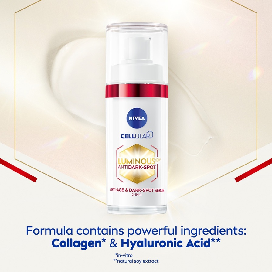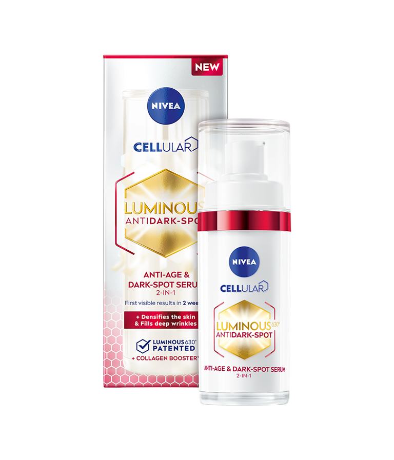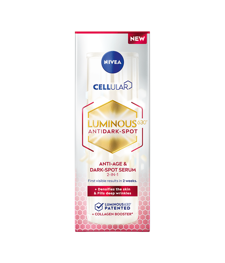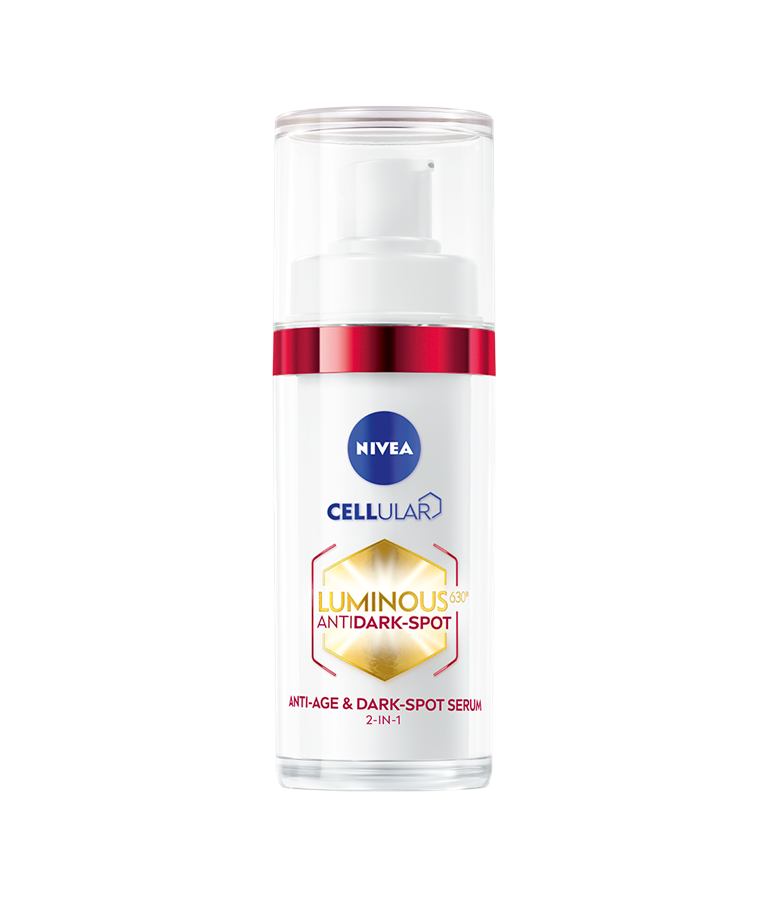 NIVEA Cellular Luminous630 Anti-Age & Dark-Spot Serum -kasvoseerumi tasapainottaa pigmentaatiota solutasolla vähentääkseen pigmenttiläiskiä ja ehkäistäkseen niiden uudelleenmuodostumista. Vähentää 10 vuoden aikana kertyneitä ikääntymisen aiheuttamia pigmenttiläiskiä. Tekee ihosta kauniin säteilevän.