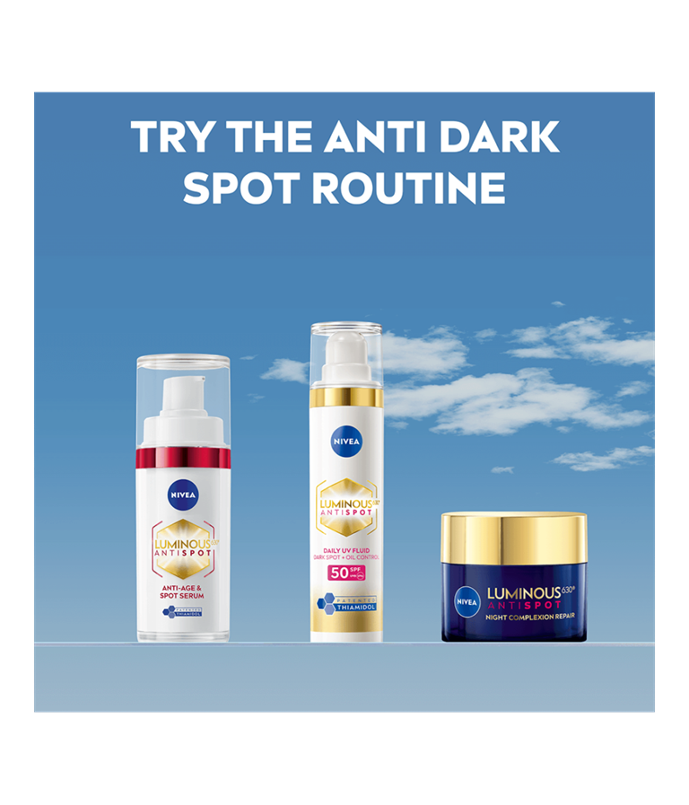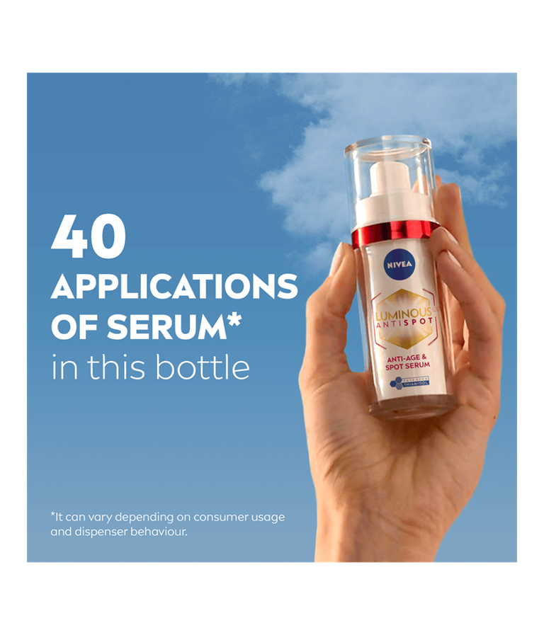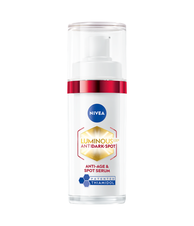 NIVEA Luminous630 Anti-Age & Dark-Spot Serum -kasvoseerumin patentoitua Thiamidolial® sisältävä koostumus yhdistää pigmenttiläiskien vähenemisen ja tehokkaan anti-age-vaikutuksen. Tämä seerumi: