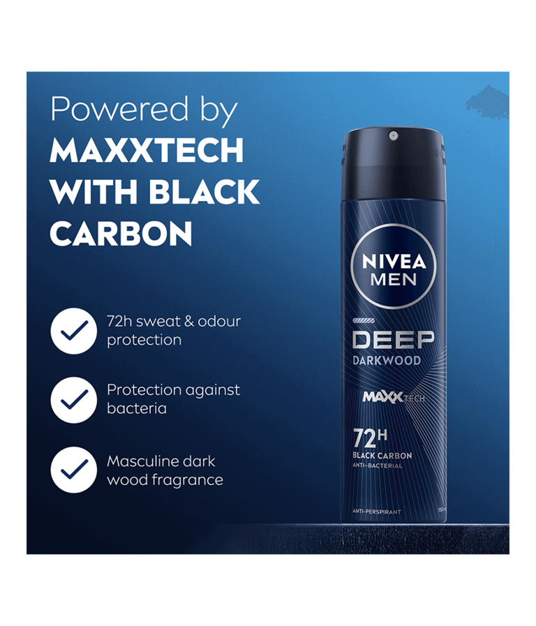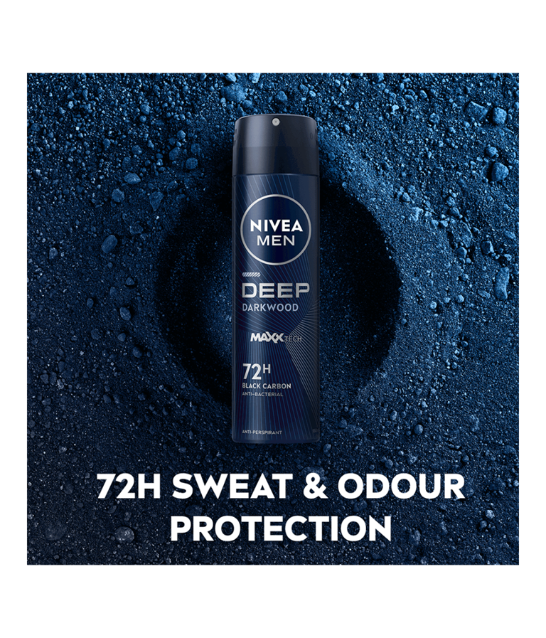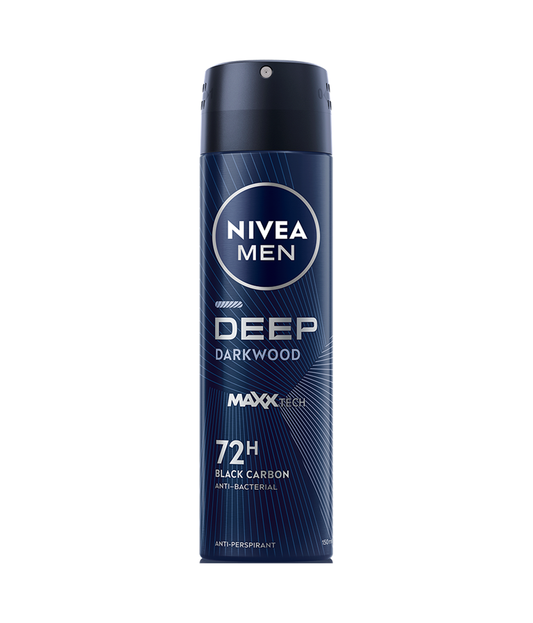 NIVEA MEN Deep Deo Spray -antiperspirantti sisältää mustaa hiiltä ja miehekkään tumman puun tuoksun. 72 tunnin tehokas antiperspiranttisuoja, joka hoitaa ihoa.