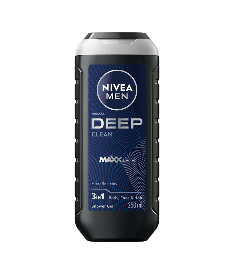 NIVEA MEN Deep Shower Gel -suihkugeeli syväpuhdistaa ihon tehokkaasti. Innovatiivinen MAXXTECH-koostumus imee tehokkaasti lian ja epäpuhtaudet iholta. Sisältää luonnollista savea ja puhdistaa, mutta samalla kosteuttaa ihoa tehden sen miellyttävän pehmeän tuntuiseksi.