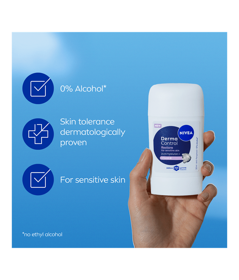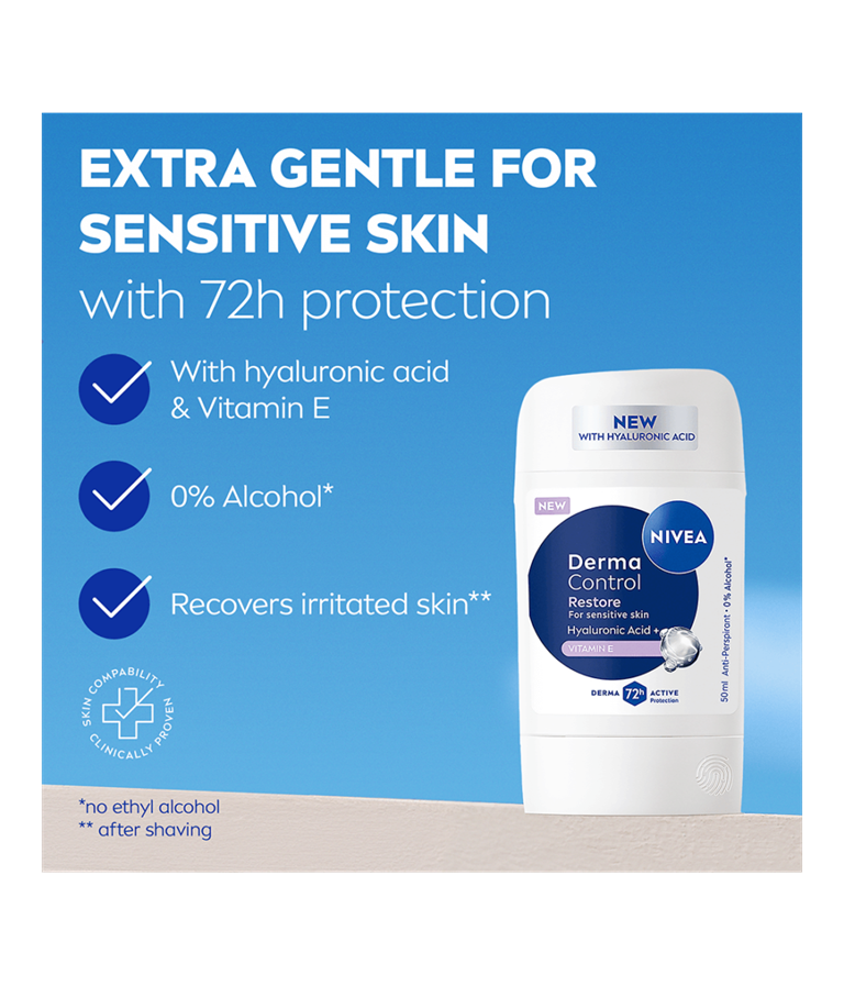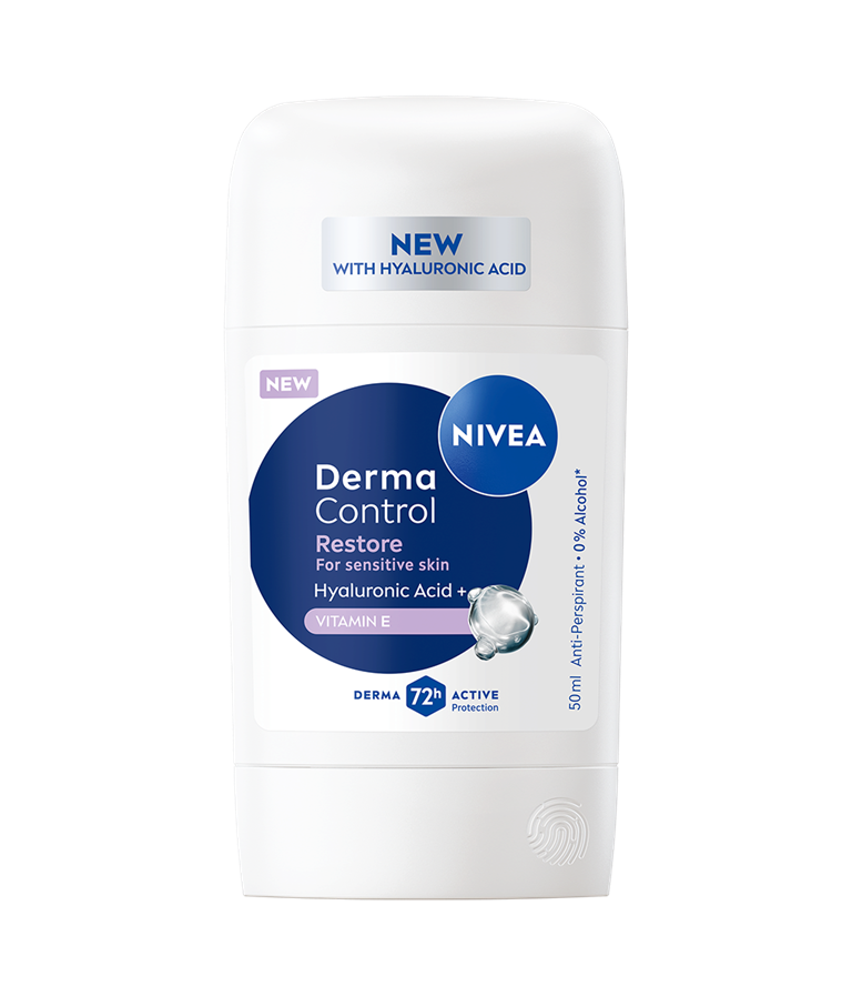 NIVEA Derma Control Restore Deo Stick -antiperspirantti antaa luotettavan 72 tunnin antiperspiranttisuojan, rauhoittaa ihoa ja edistää sen palautumista karvanpoiston jälkeen. Sopii erittäin herkälle iholle, allergiaystävällinen tuoksu.
