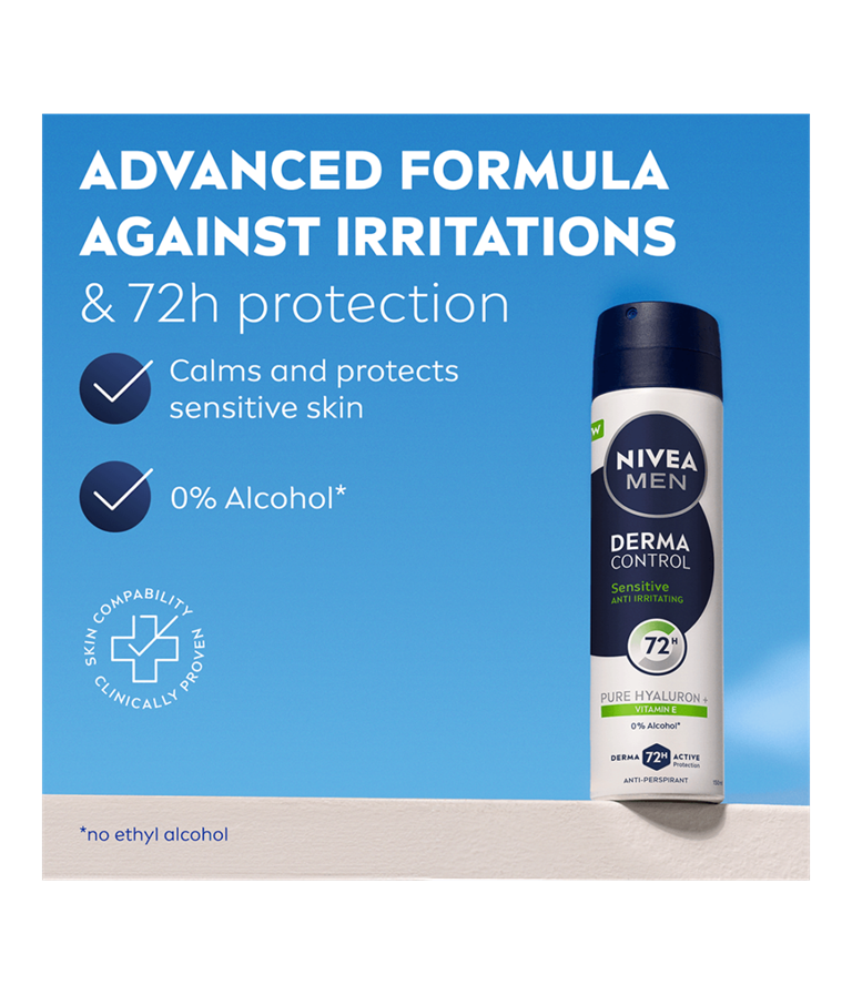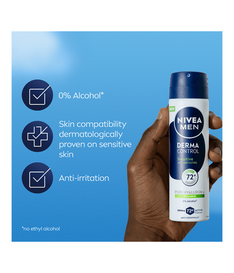 NIVEA MEN Derma Control Sensitive Deo Spray -antiperspirantti antaa luotettavan 72 tunnin antiperspiranttisuojan, samalla suojaten herkkää ihoa ärsytykseltä.