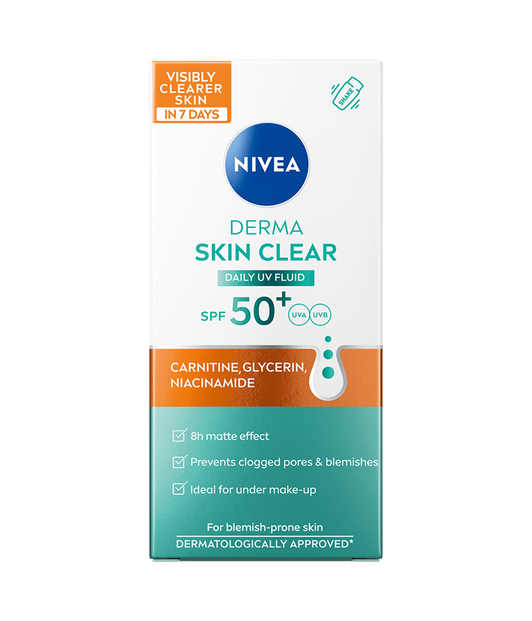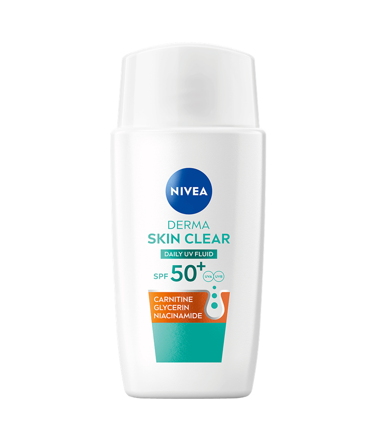 NIVEA Derma Skin Clear UV Daily Fluid SK50+ -päivävoide sisältää suojakertoimen 50+, karnitiinia, glyceriiniä ja niasiiniamidia ja on erityisesti kehitetty epäpuhtauksiin taipuvaiselle iholle. Vähentää epäpuhtauksia ja ehkäisee niiden syntymistä sekä ihohuokosten tukkiutumista.