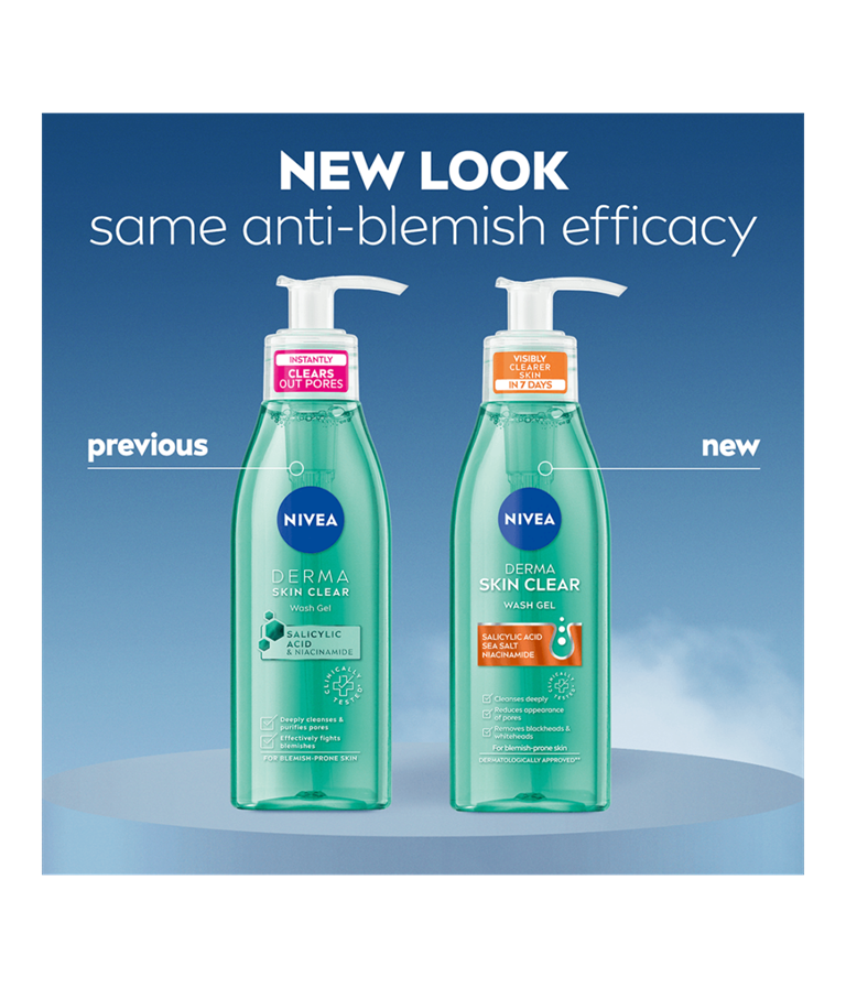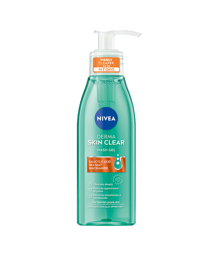 NIVEA Derma Skin Clear Wash Gel -kasvojenpuhdistusgeeli syväpuhdistaa ihon ja vähentää epäpuhtauksia.