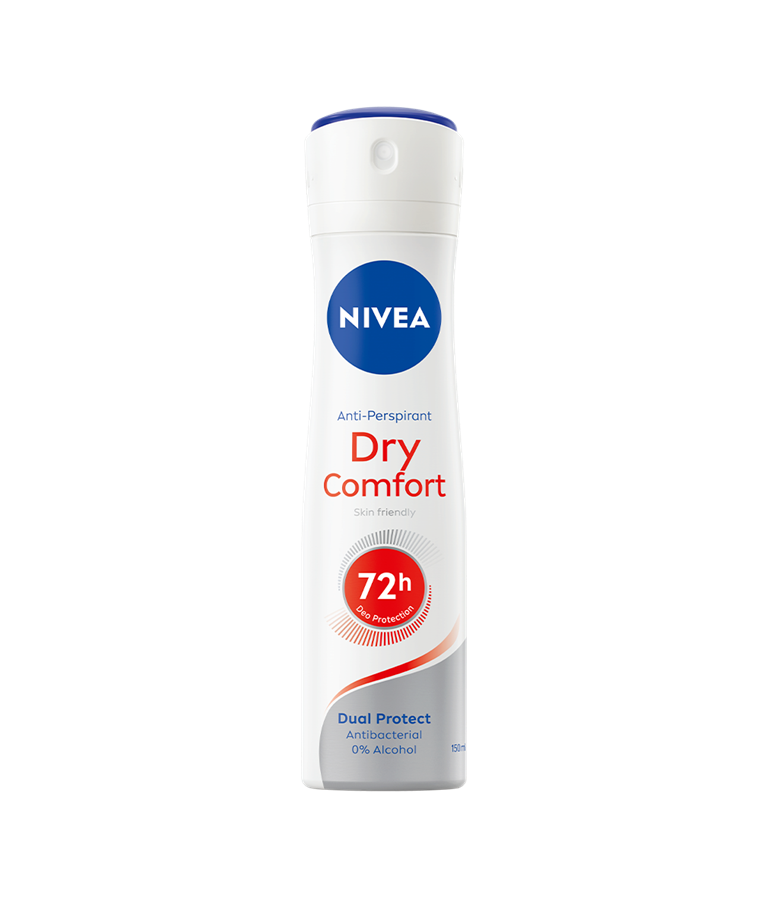 NIVEA Dry Comfort Deo Spray -antiperspirantti antaa tehokkaan ja luotettavan suojan hikoilua vastaan jopa 72 tunniksi.