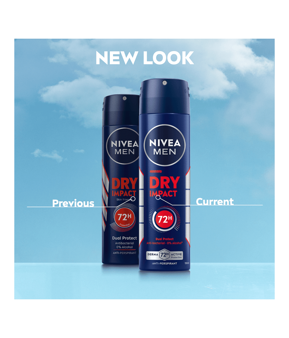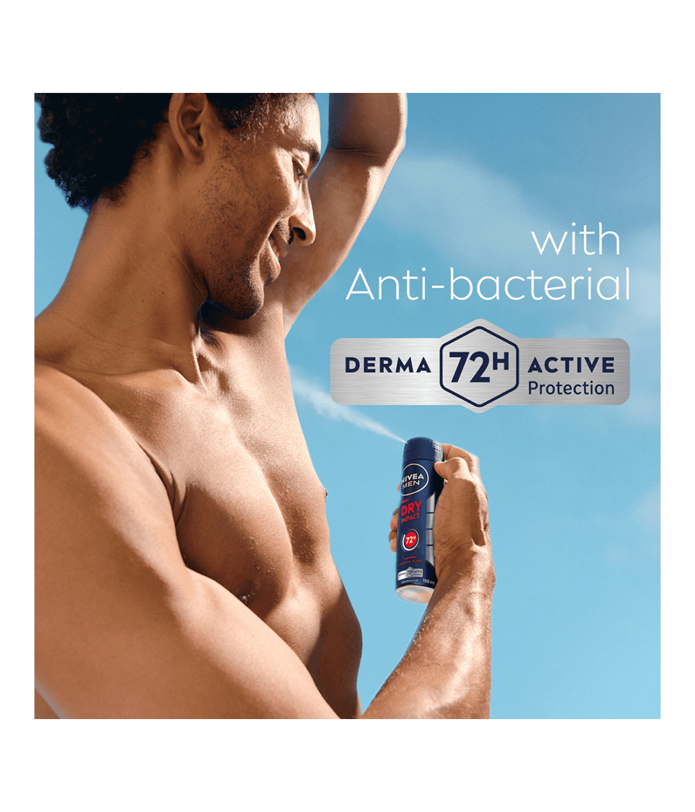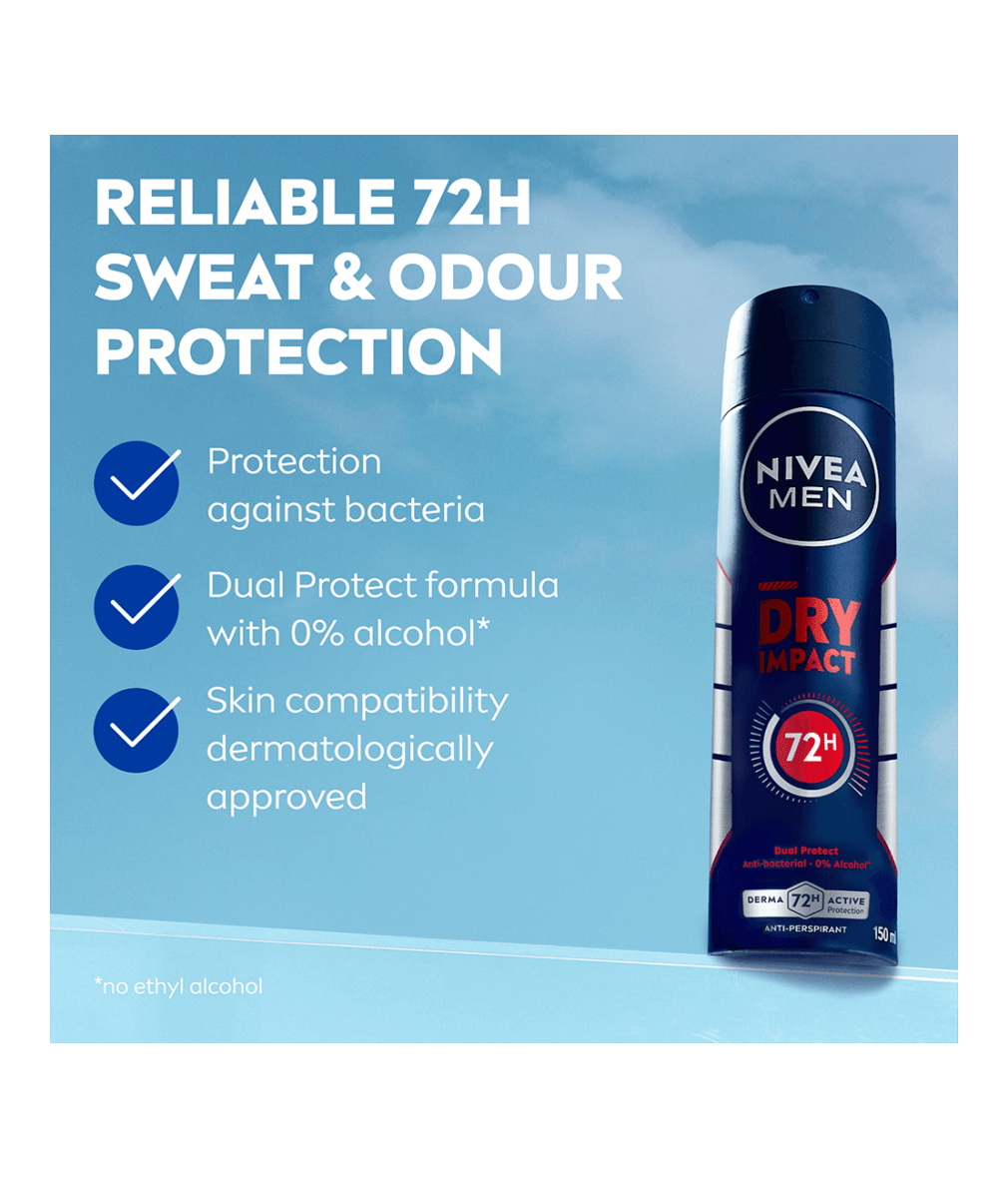 NIVEA MEN Dry Impact Spray -antiperspirantti antaa tehokkaan ja luotettavan suojan hikoilua vastaan jopa 72 tunniksi.
