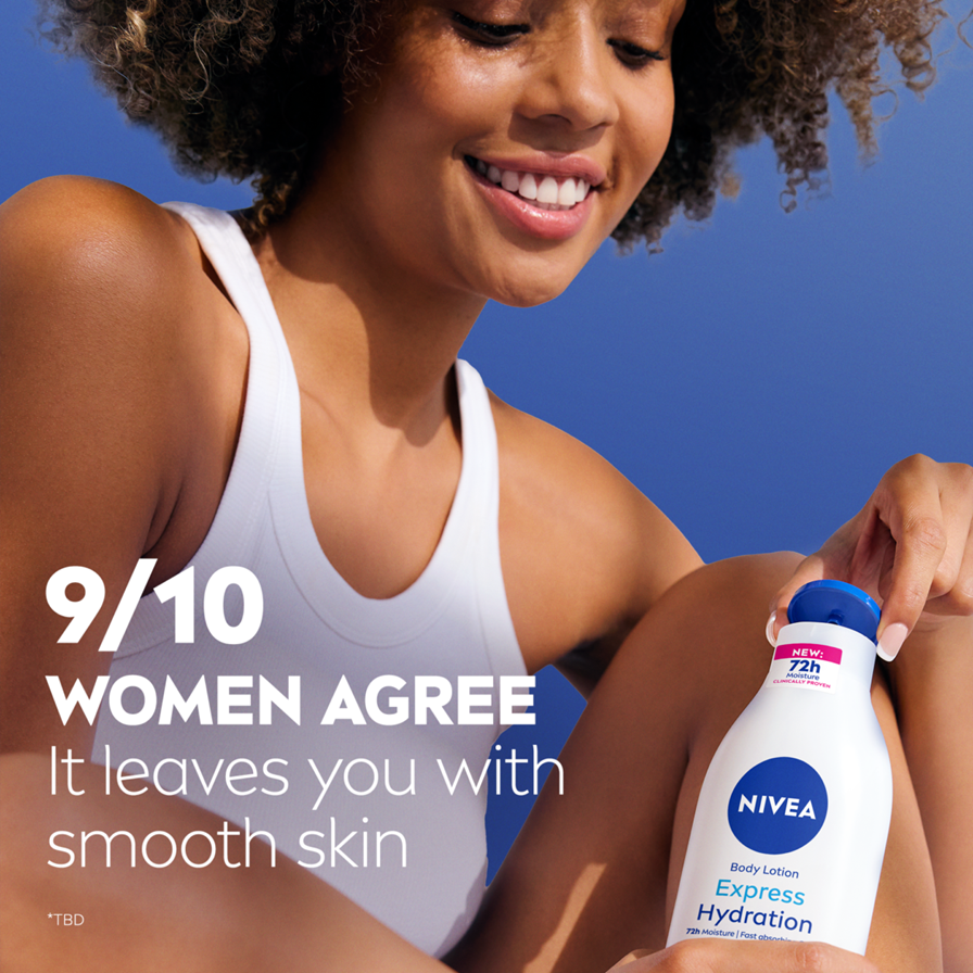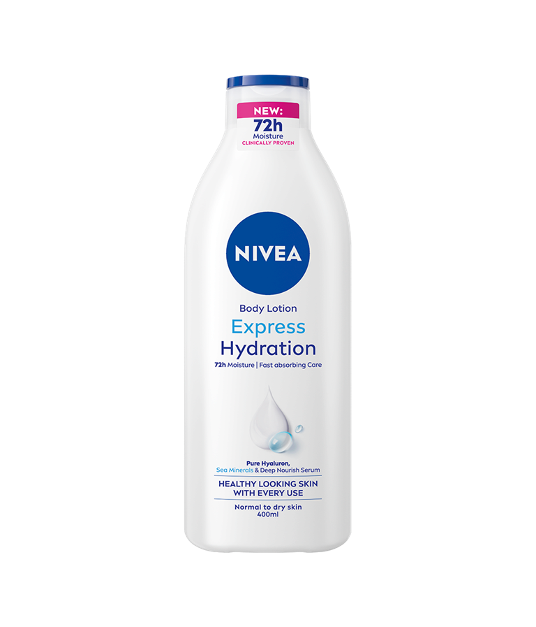 Nopeasti imeytyvää syväkosteuttavaa hoitoa ja huomattavasti pehmeämpi iho 72 tunnin ajaksi: NIVEA Express Hydration Body Lotion.