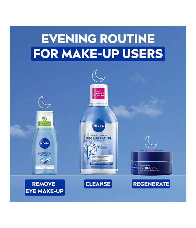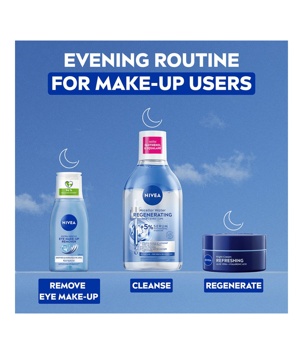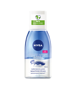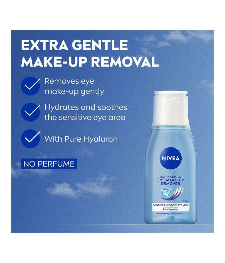 NIVEA Extra Gentle Eye Make-Up Remover -silmämeikinpoistoaineen hyaluronihappoa sisältävä koostumus poistaa tehokkaasti ripsivärin ja silmämeikin, samalla kosteuttaen ja rauhoittaen ihoa.