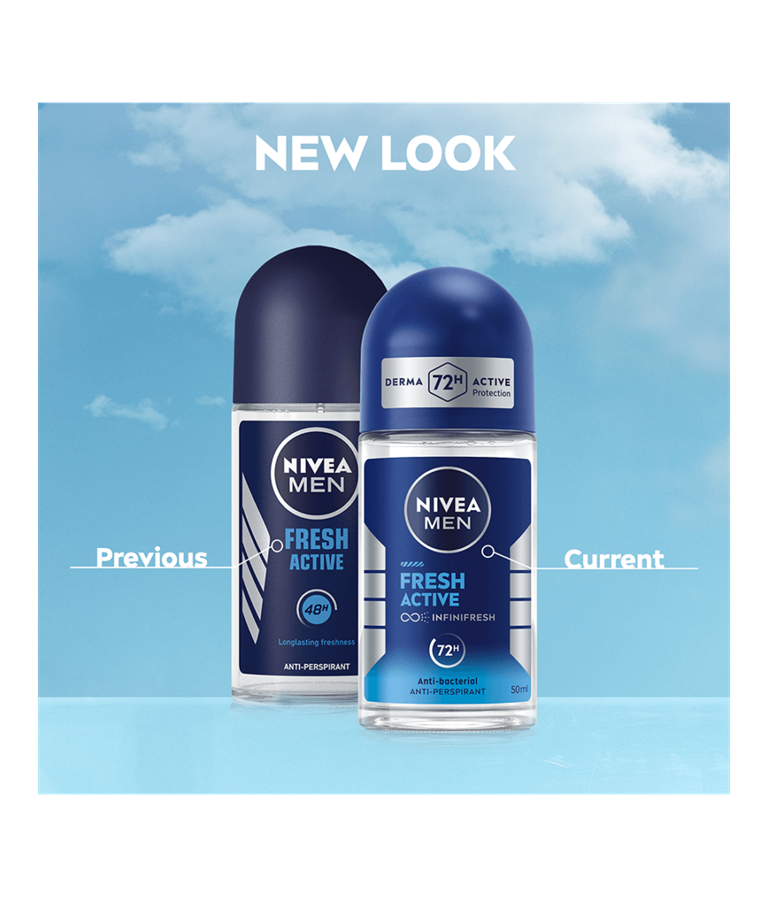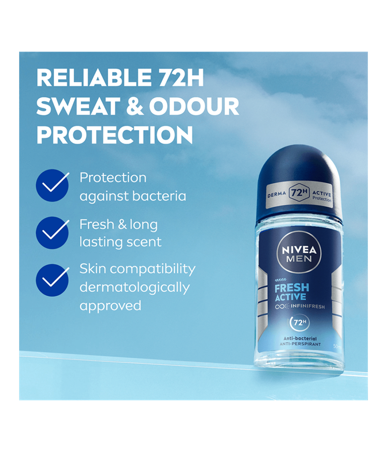 NIVEA MEN Fresh Active Deo Roll-on -antiperspirantti pitää sinut raikkaana ja antaa tehokkaan ja luotettavan 72 tunnin antiperspiranttisuojan.