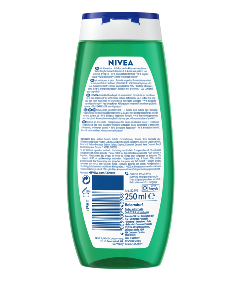 NIVEA Fresh Aloe Shower Gel -suihkugeeli sisältää luonnollista aloe veraa ‒ virkistää ja raikastaa välittömästi.