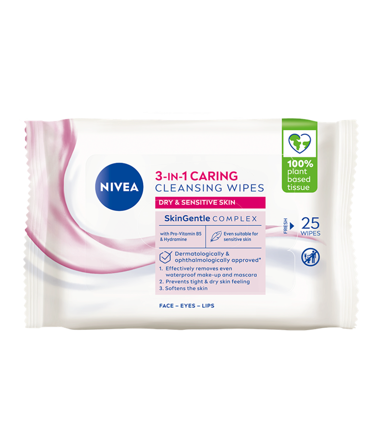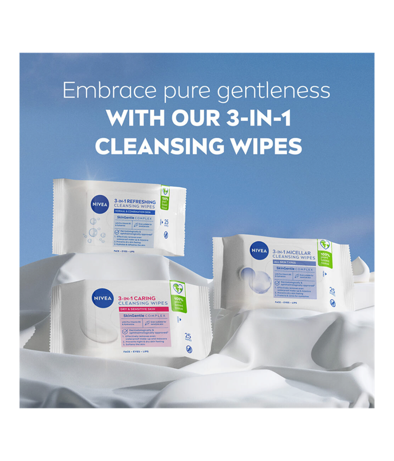 NIVEA 3-in-1 Caring Cleansing Wipes -puhdistusliinat poistavat meikit puhdistaen ja kosteuttaen ihoa. Hellä manteliöljy hoitaa kuivaa ihoa.