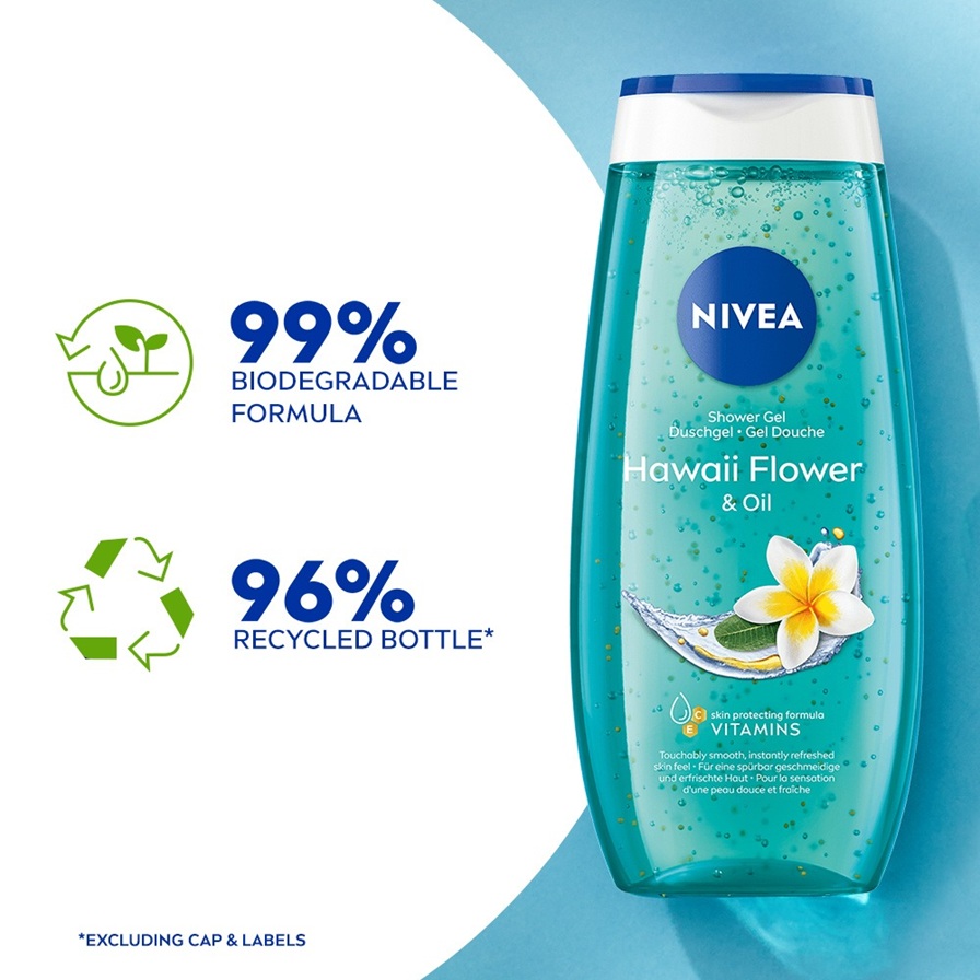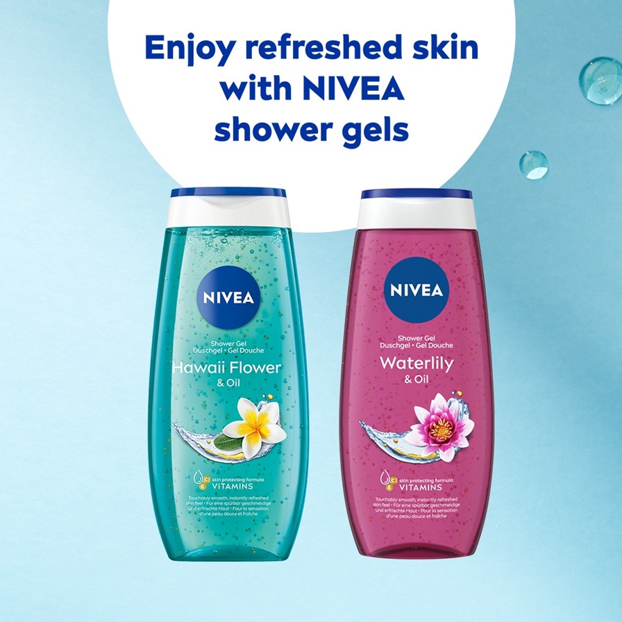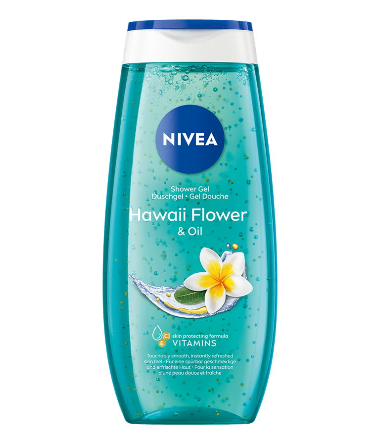 NIVEA Hawaii Flower & Oil Shower -suihkugeeli sisältää hoitavia öljyhelmiä, C-vitamiinia ja E-vitamiinia ja raikkaan eksoottisen tuoksun. Hoitaa pehmeästi ihoasi.