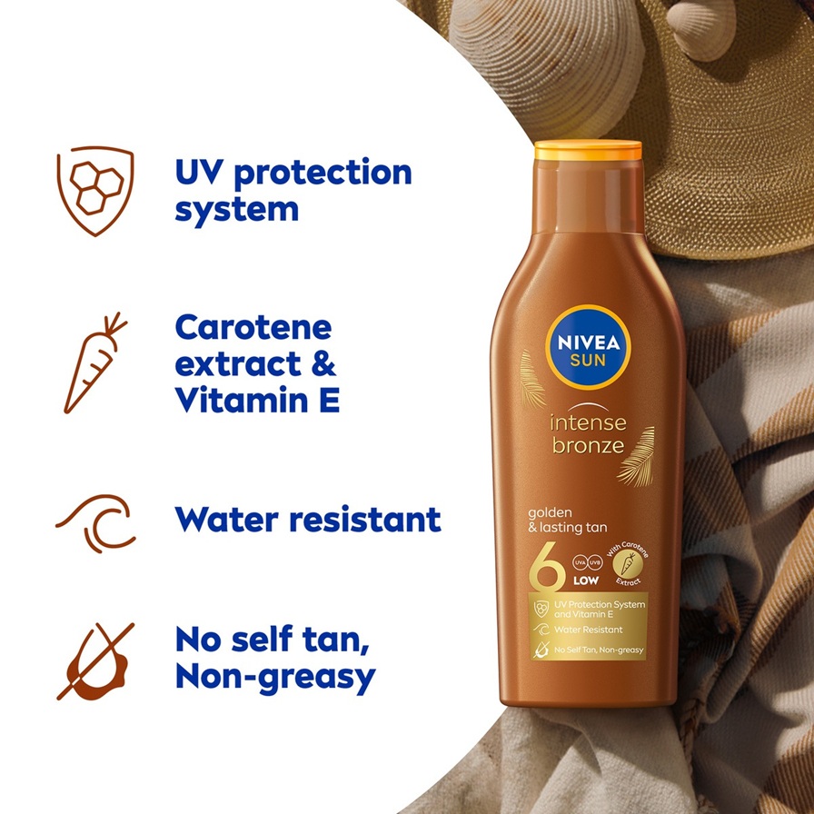 Intense Bronze Sun Lotion SK 6 -aurinkosuojavoide ylläpitää kaunista rusketusta ja suojaa samalla haitallisilta UV-säteiltä. Sisältää karoteeniuutetta ja E-vitamiinia.