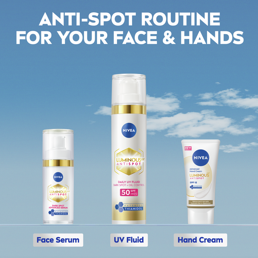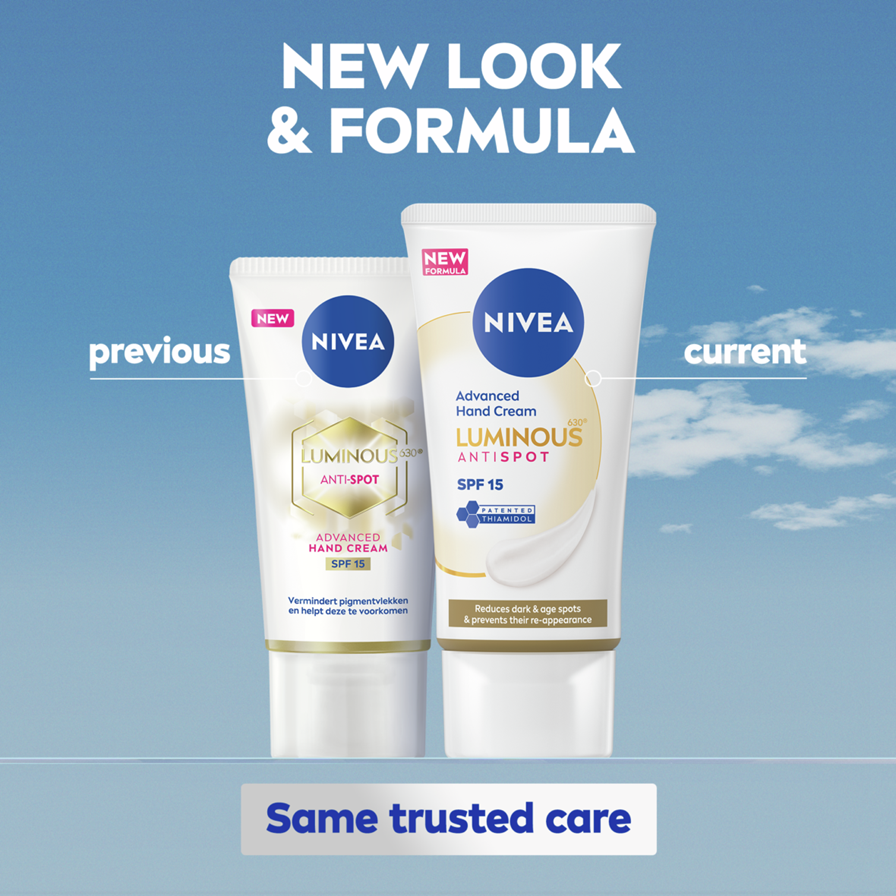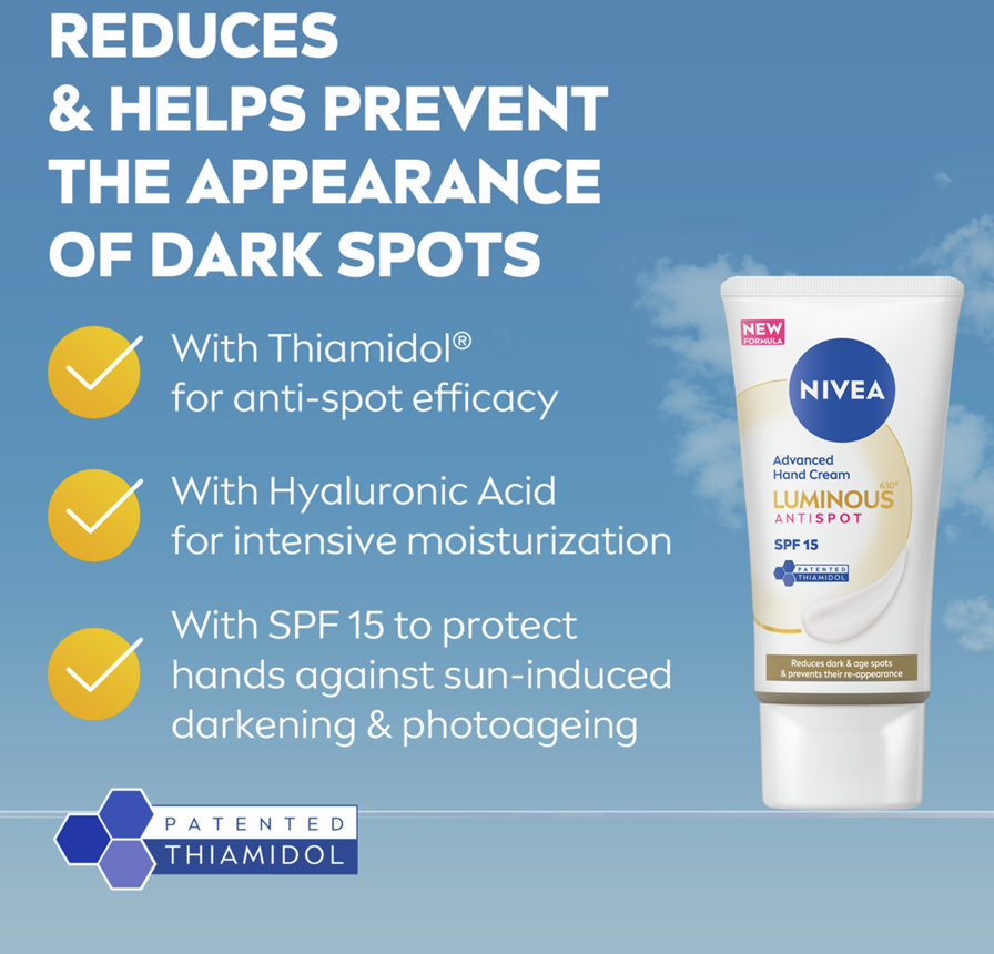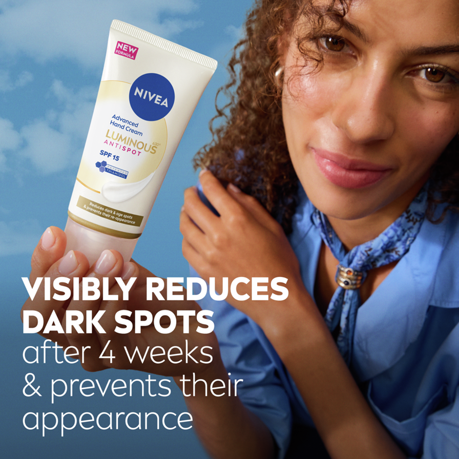 NIVEA Luminous630 Anti Dark-Spot Hand Cream -käsivoide vähentää tummia läiskiä ja ehkäisee niiden syntymistä. Kosteuttaa tehokkaasti käsiä ja tekee ihosta tasaisen sävyisen.