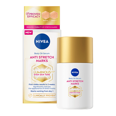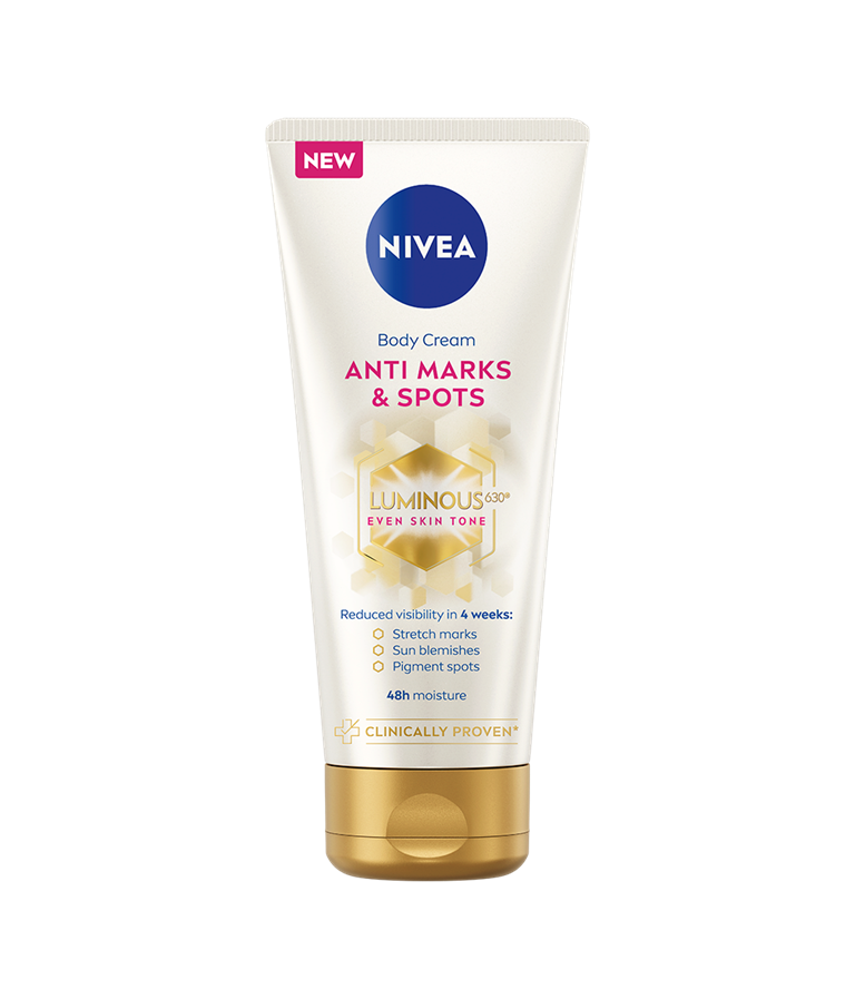 NIVEA Luminous630 Anti Marks & Spots Body Cream -vartalovoiteen hoitava, ihonsävyä tasoittava koostumus sisältää patentoitua LUMINOUS630®-ainesosaa. Voide tasoittaa ihonsävyn epätasaisuuksia vähentääkseen raskausarpien ja pigmenttiläiskien näkyvyyttä.