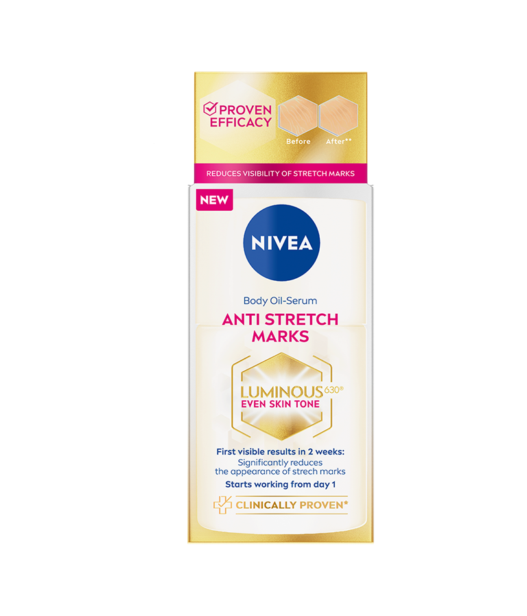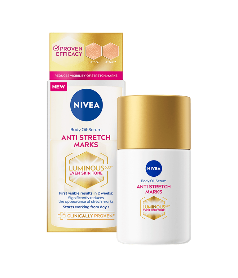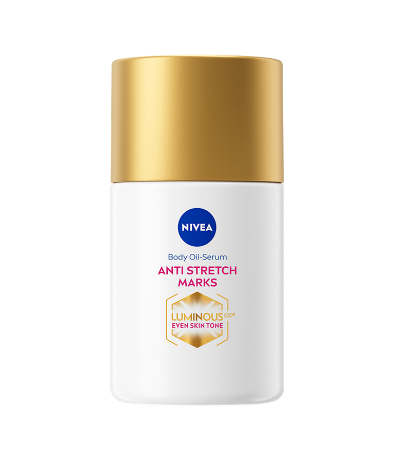NIVEA Luminous630 Anti Stretch Marks Body Oil Serum -öljyseerumi on vallankumouksellinen innovaatio, joka tasoittaa ihonsävyä. Erittäin tehokas, patentoitu LUMINOUS630®-ainesosa vähentää näkyvästi raskauden, hormonien & painonvaihtelun aiheuttamien raskausarpien näkyvyyttä.