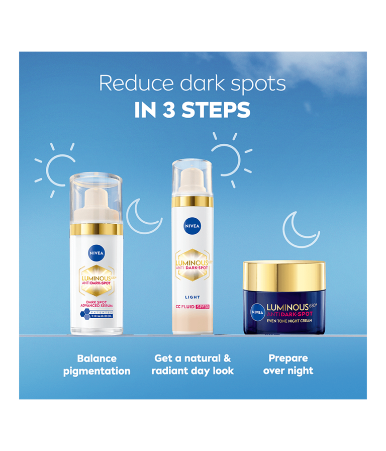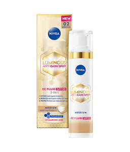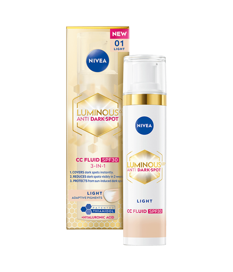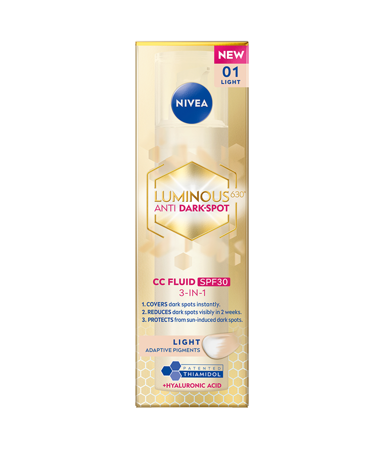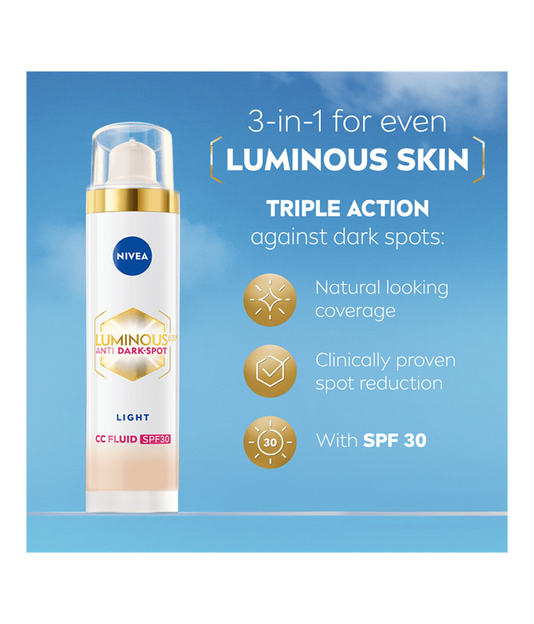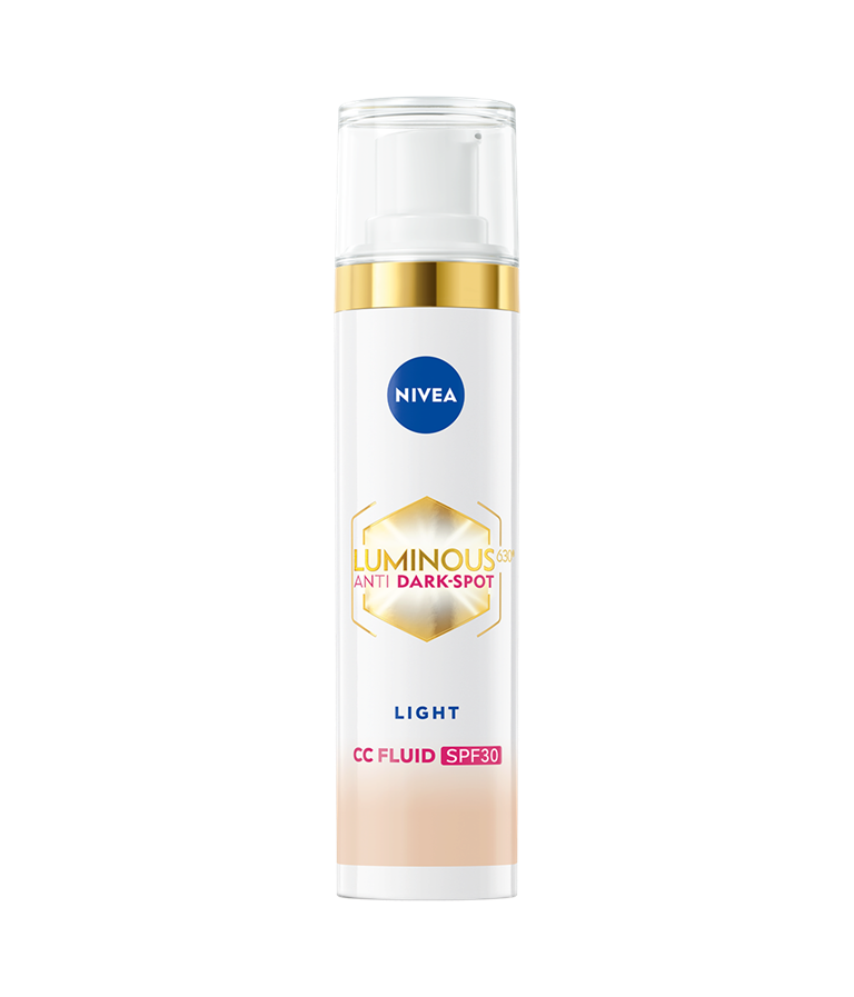 NIVEA Luminous630 Anti Dark-Spot CC Fluid Light SK30 - sävyttävä päivävoide antaa iholle luonnollisen peittävyyden, vähentää pigmenttiläiskiä ja ehkäisee uusien syntymistä - näkyvät tulokset 2 viikossa. Tekee ihosta tasaisen, kirkkaan ja säteilevän.