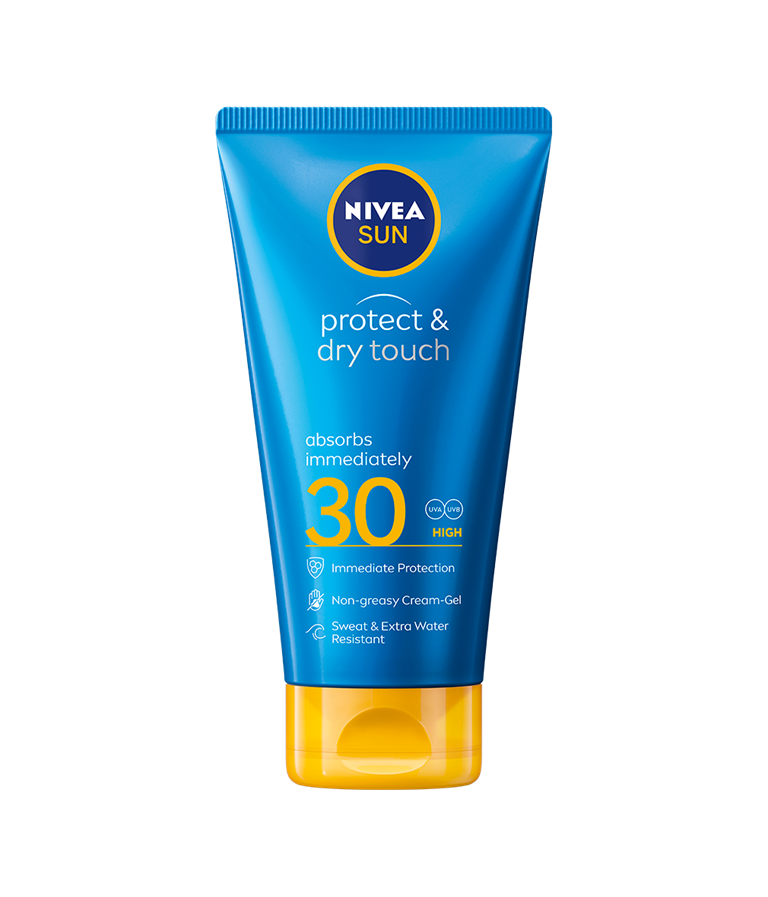 Protect & Dry Touch Sun Cream-Gel -aurinkovoide on helppo levittää, imeytyy välittömästi, eikä jätä iholle rasvaista tunnetta.