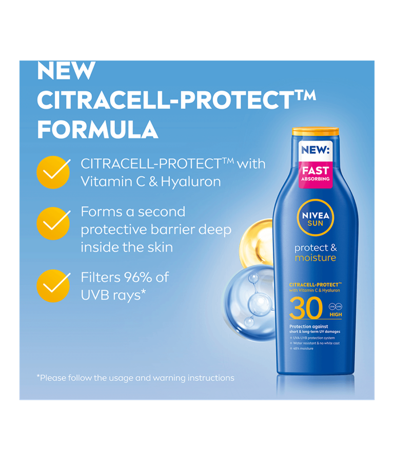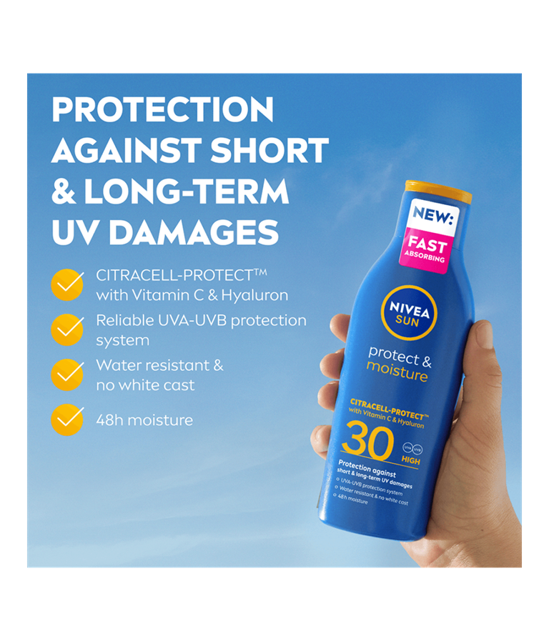 Luotettava suoja UV-säteilyn lyhyt- ja pitkäaikaisia haittavaikutuksia vastaan uudella, nopeasti imeytyvällä NIVEA SUN Protect & Moisture Sun Lotion -aurinkovoiteen Citracell-Protect™ -koostumuksella.