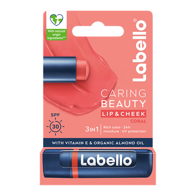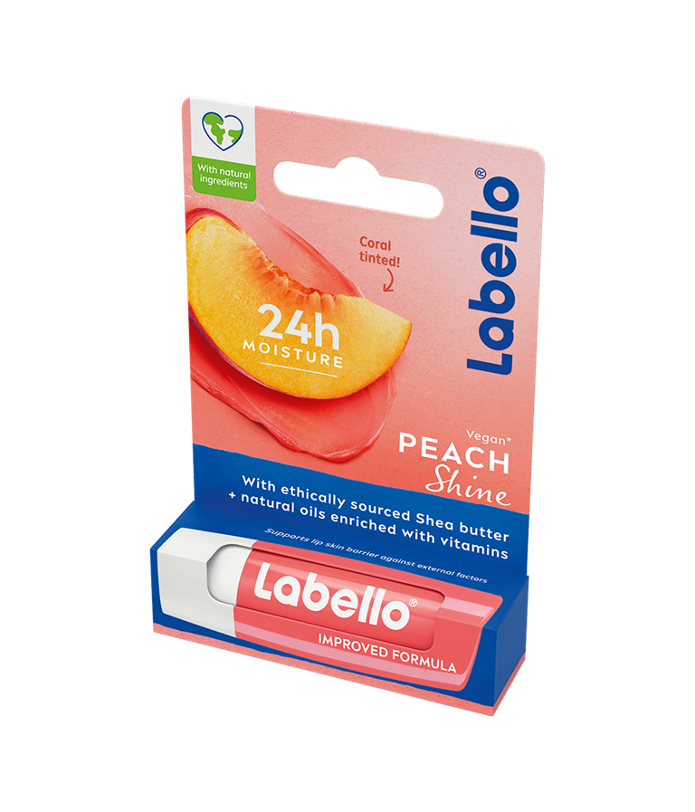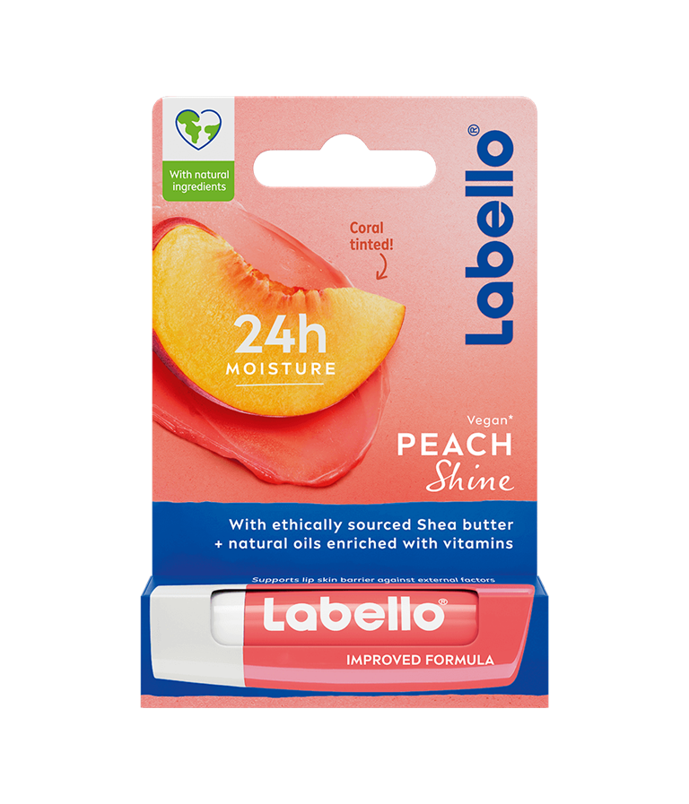 Labello Peach Shine -huulivoide antaa kauniin korallinsävyn huulille ja pitää ne kosteutettuina.