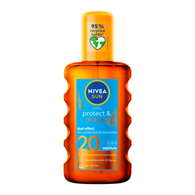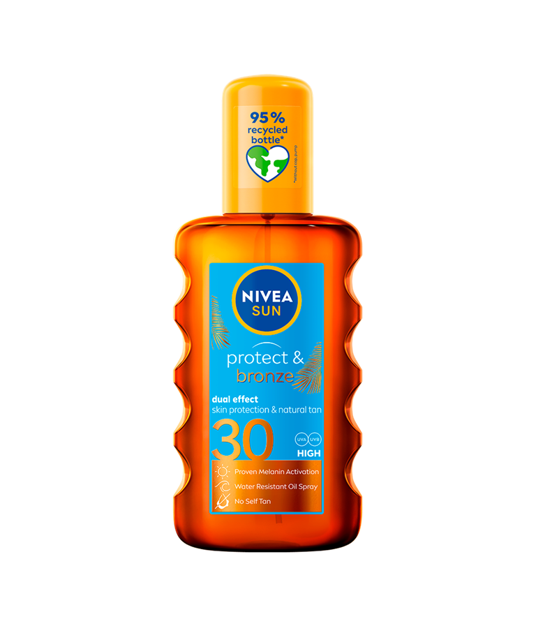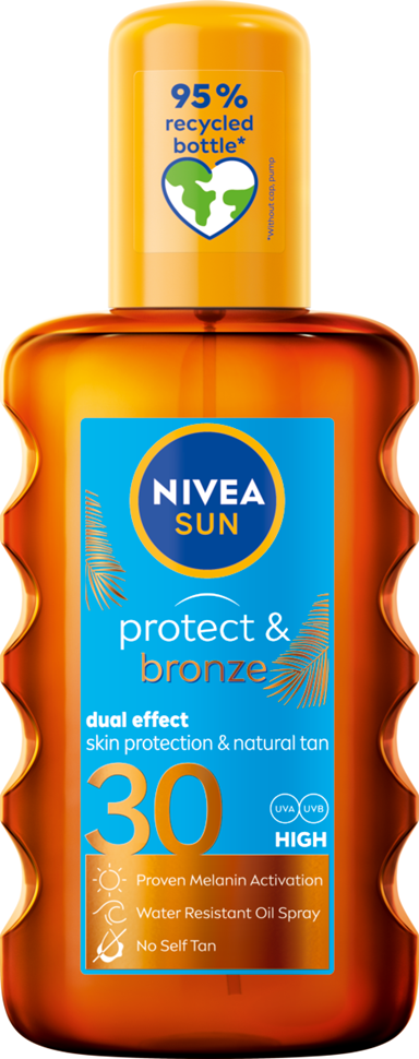 Protect & Bronze Oil Spray -aurinkosuojaöljy tarjoaa erittäin tehokkaan UVA/UVB-suojan ja edistää ihon luonnollista ruskettumisprosessia. Suojakerroin 30.