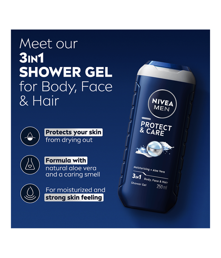 NIVEA MEN Protect & Care Shower Gel -suihkugeelin luonnollista aloe veraa sisältävä koostumus puhdistaa ihon tehokkaasti, hoitaa ja kosteuttaa ihoa sekä suojaa sitä kuivumiselta.