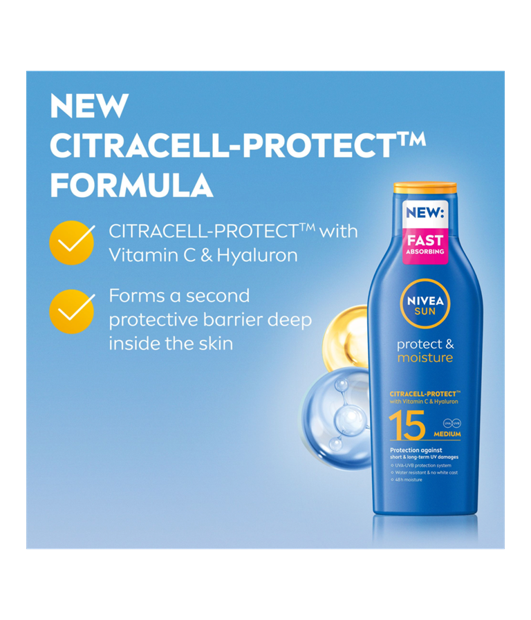 Luotettava suoja UV-säteilyn lyhyt- ja pitkäaikaisia haittavaikutuksia vastaan uudella, nopeasti imeytyvällä NIVEA SUN Protect & Moisture Sun Lotion -aurinkovoiteen Citracell-Protect™ -koostumuksella.