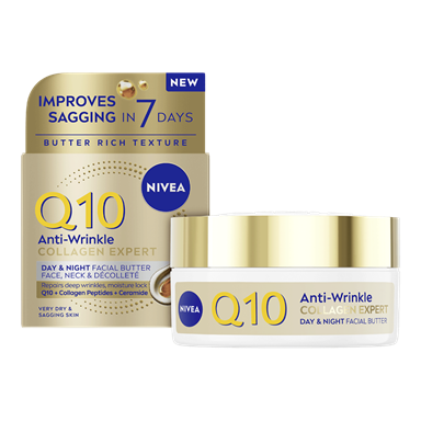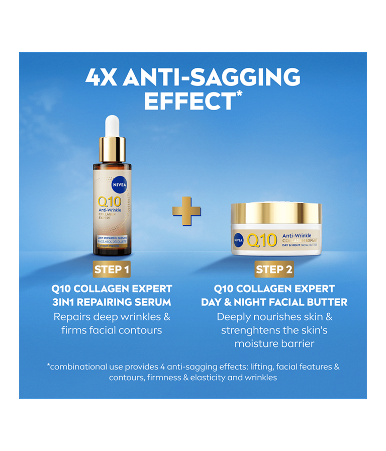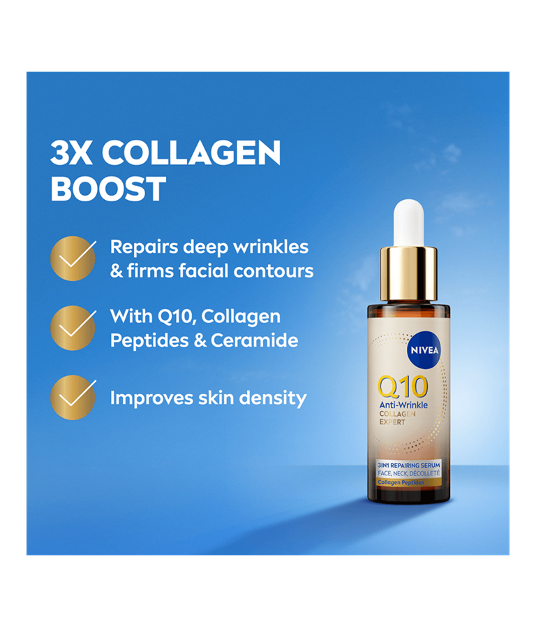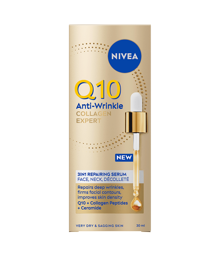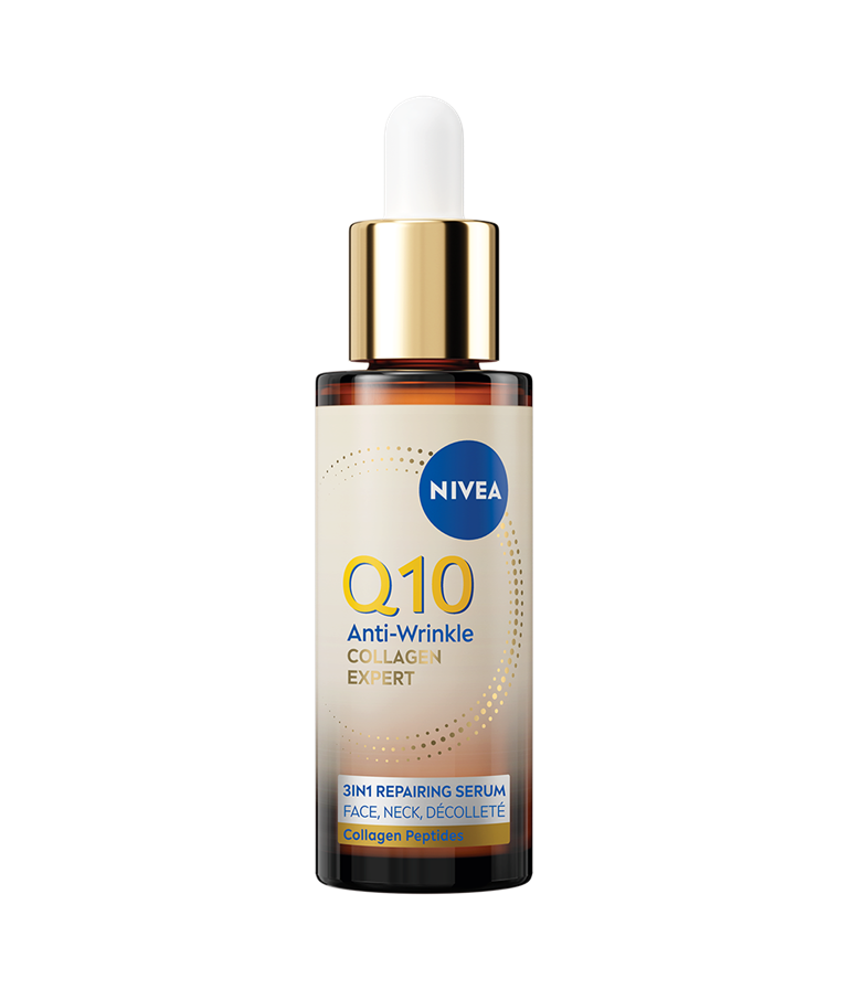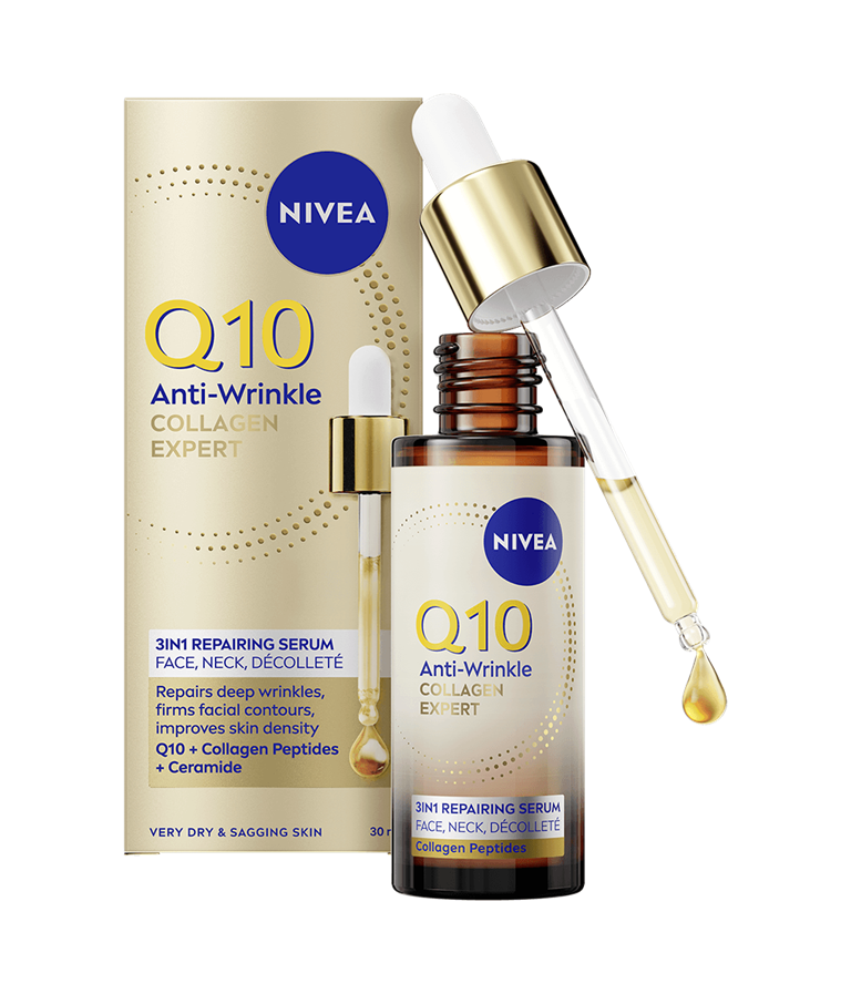 NIVEA Q10 Anti-Wrinkle Collagen Expert 3in1 Repairing Serum -kasvoseerumi kiinteyttää ihoa, vähentää tehokkaasti jopa syvimpiä ryppyjä ja ryhdistää kasvonpiirteitä. Tehokas seerumi sisältää tehokkaan yhdistelmän puhdasta Q10-entsyymiä, keramideja ja kollageenipeptidejä.
