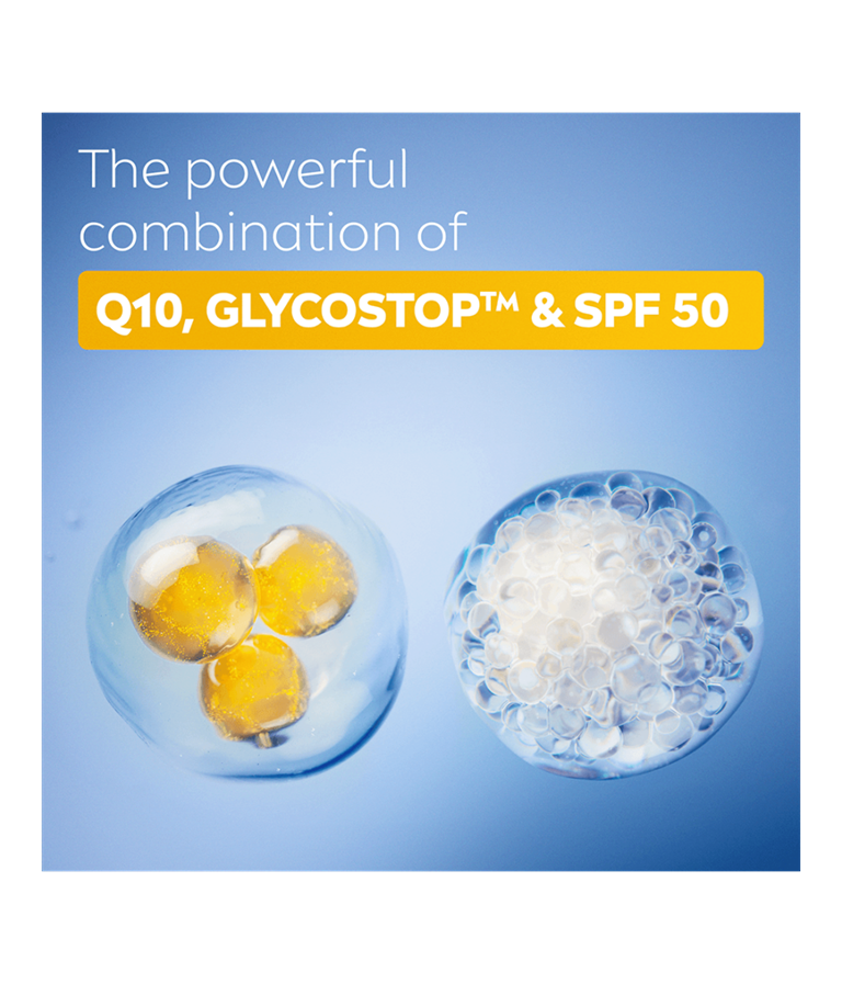 - Sisältää puhdasta Q10:ä, Glycostop-ainesosan ja laajakirjoisia UV-suodattimia