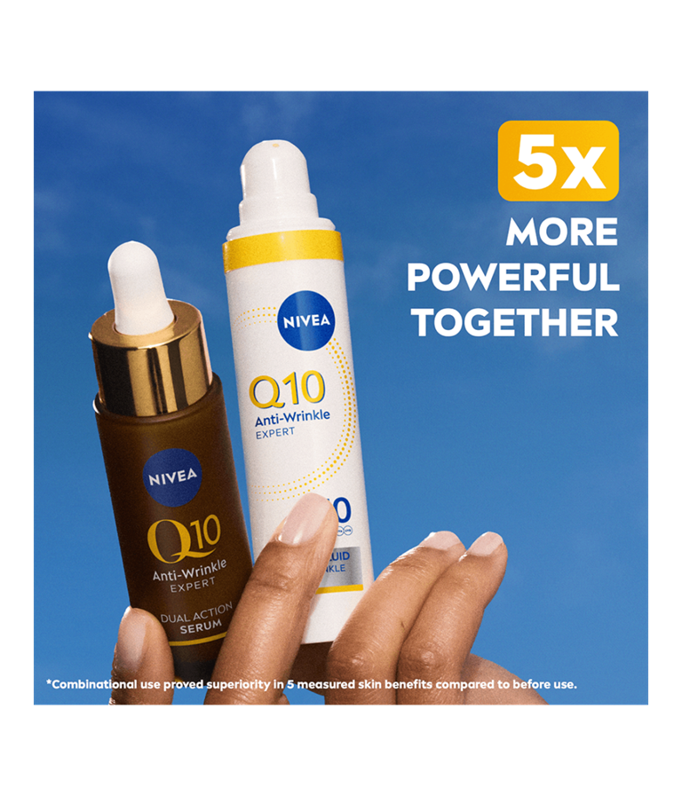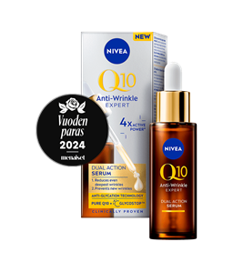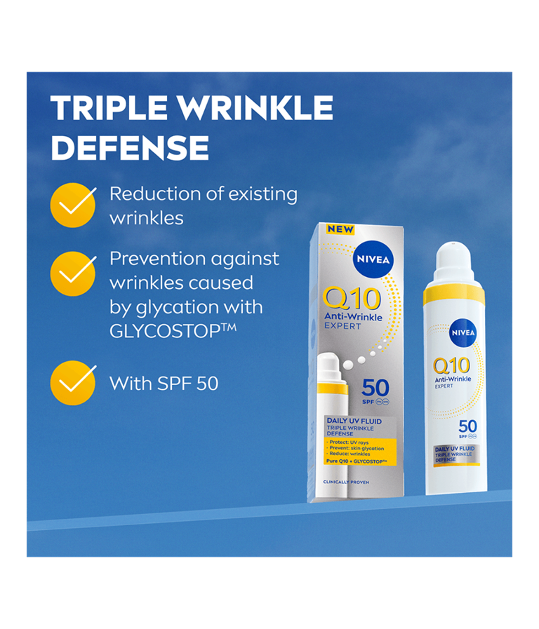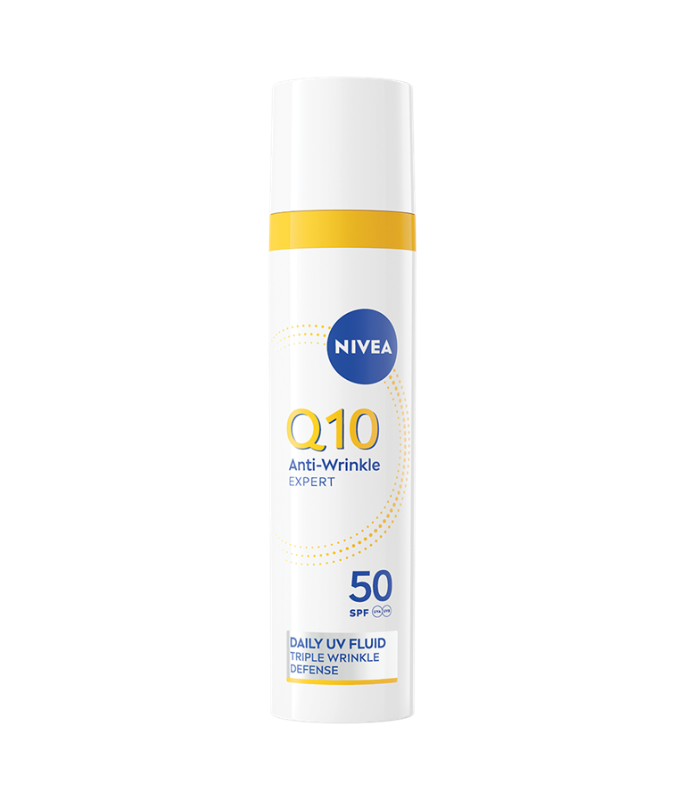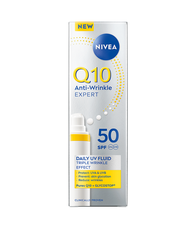 NIVEA Q10 Anti-Wrinkle Expert Daily UV Fluid SK 50 -päivävoide antaa iholle tehokkaan suojan UV-säteilyltä, ehkäisee ihon sokeroitumista ja minimoi ryppyjen näkyvyyttä.