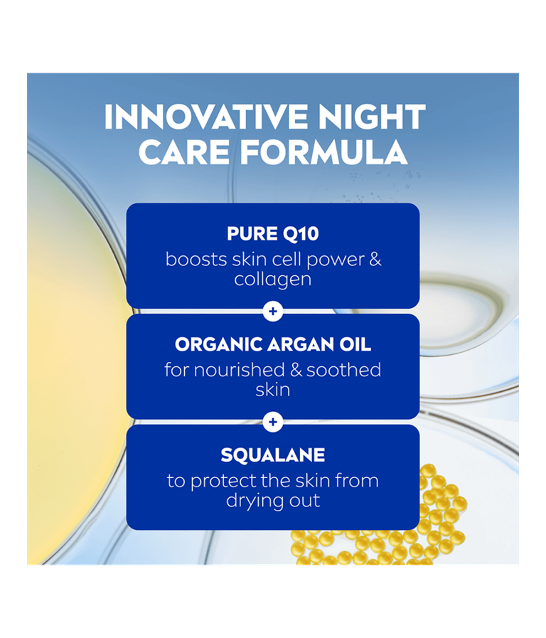 Ravitseva yövoide kuivalle ja erittäin kuivalle iholle sisältää puhdasta Q10:tä, skvalaani ja arganöljyä. Kosteuttaa ihoa tehokkaasti, tekee ihosta kiinteämmän ja plautuneen näköisen.