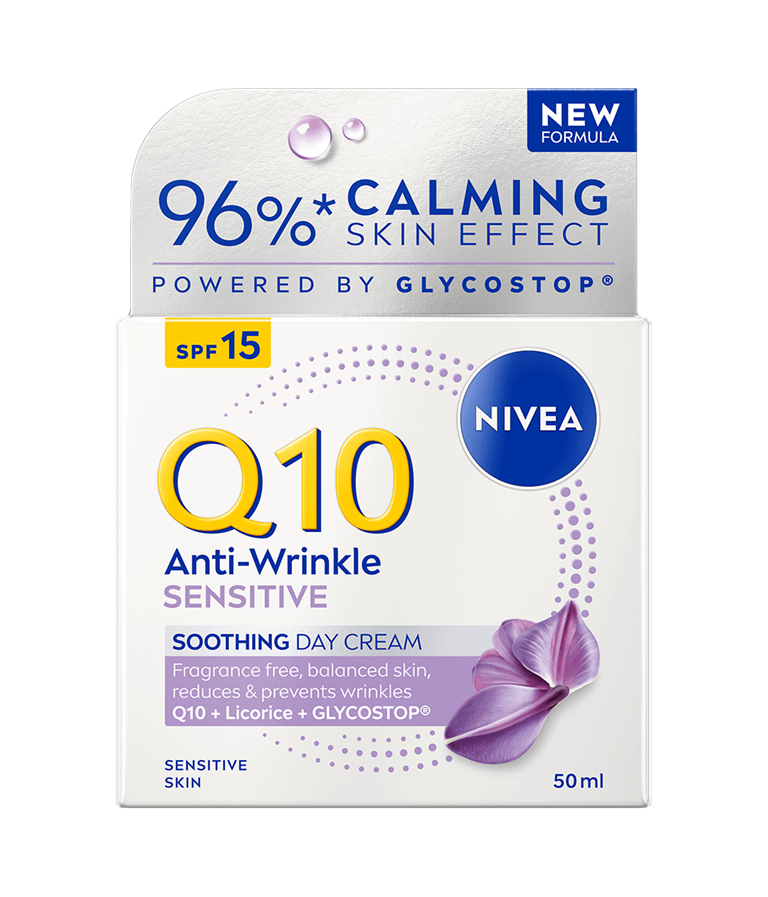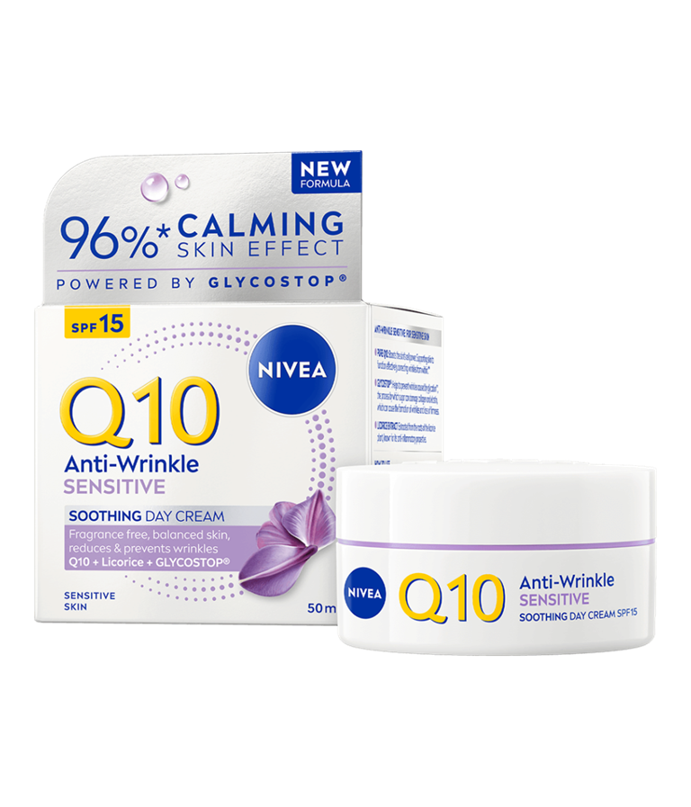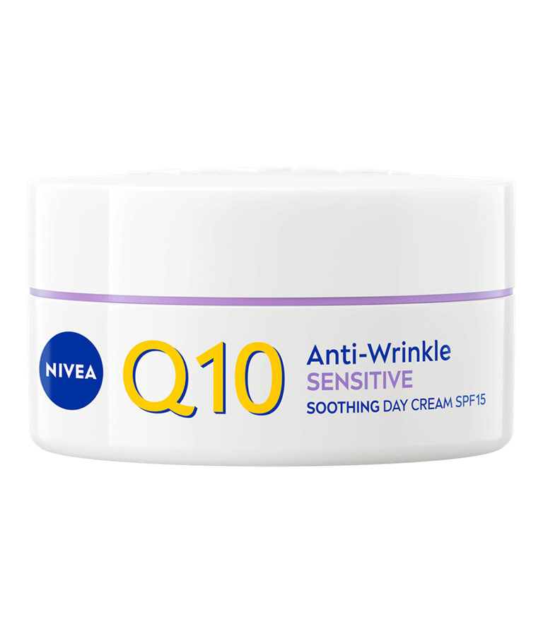 NIVEA Q10 Anti-Wrinkle Sensitive Soothing SK 15 -päivävoiteen hajusteeton koostumus rauhoittaa ihoa samalla vähentäen ja ennaltaehkäisten ryppyjä.