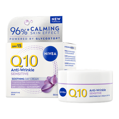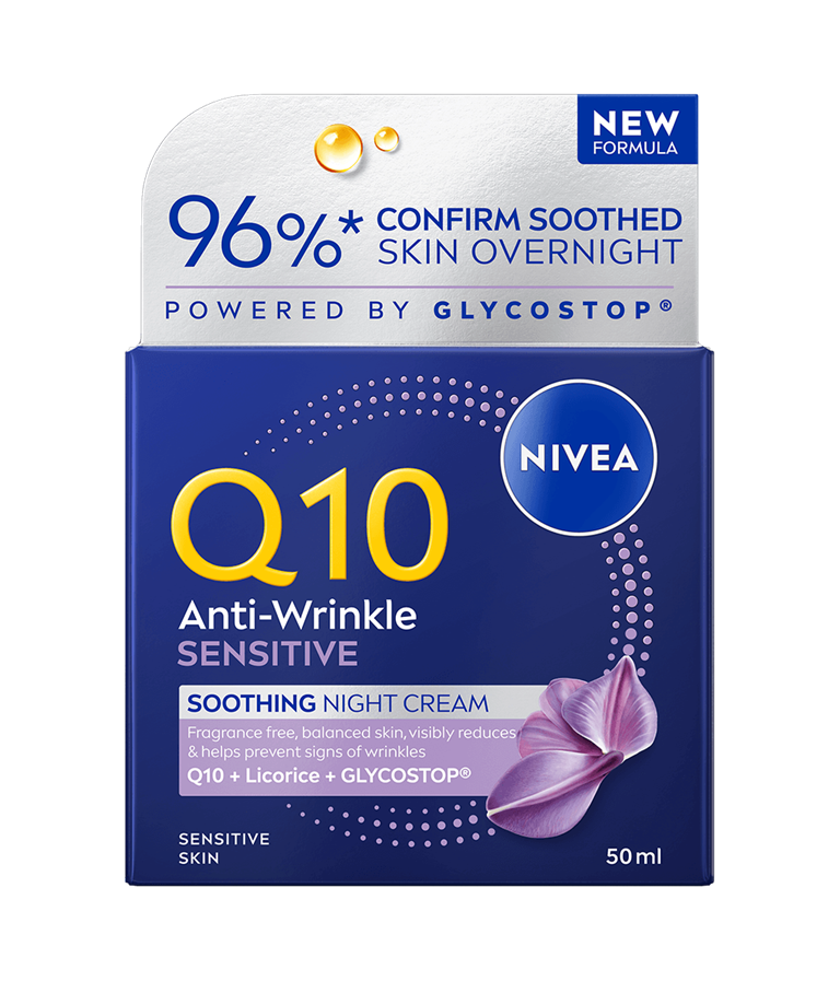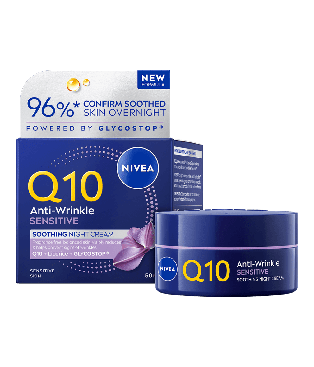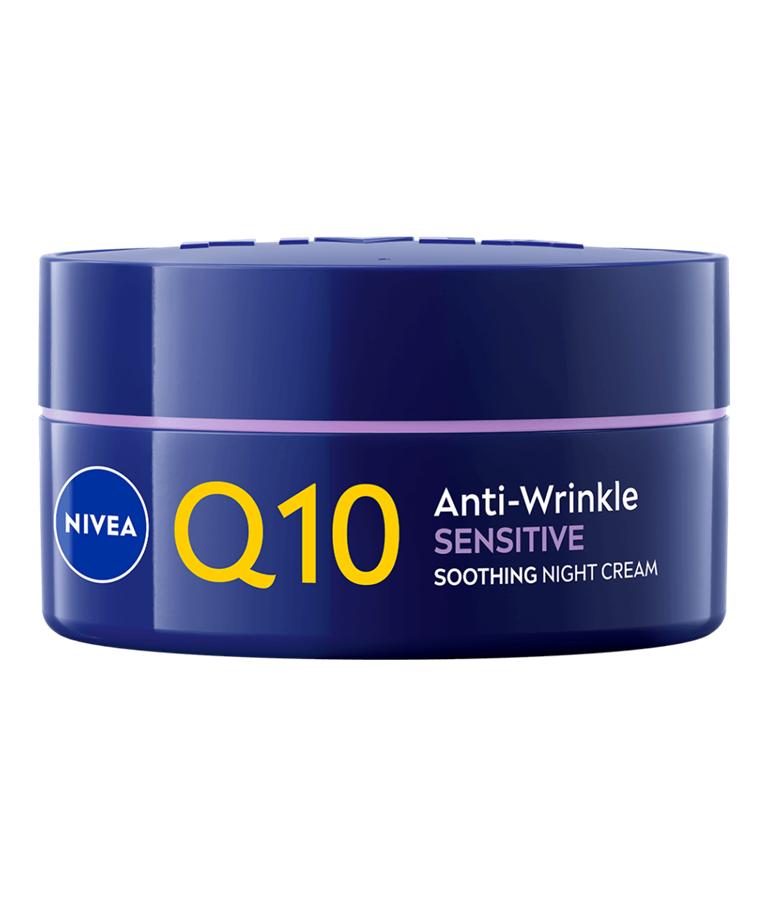 NIVEA Q10 Anti-Wrinkle Sensitive Soothing Night Cream -yövoiteen hajusteeton koostumus rauhoittaa herkkää ihoa, samalla vähentäen ja ennaltaehkäisten ryppyjä.