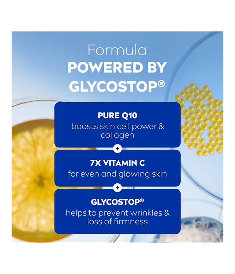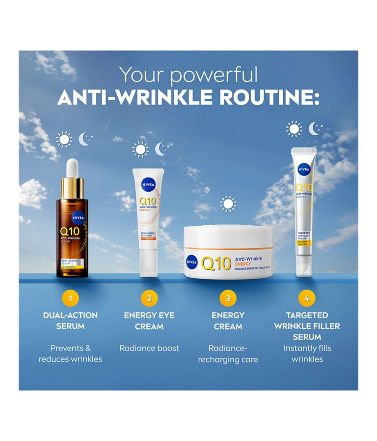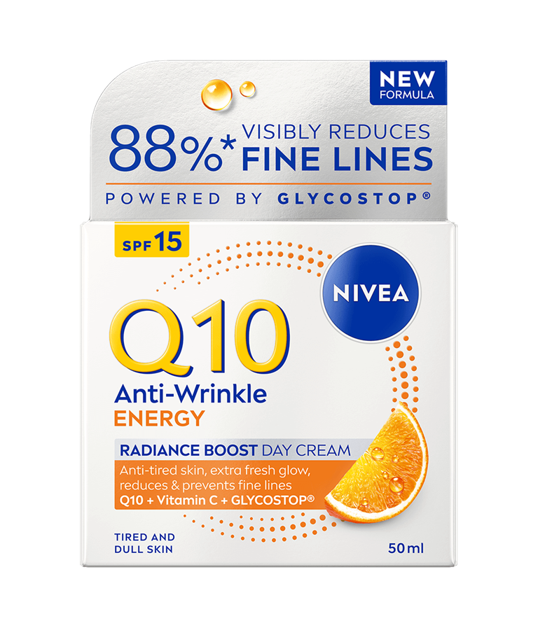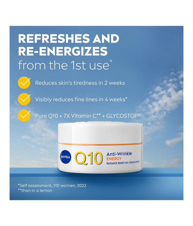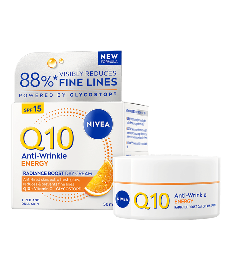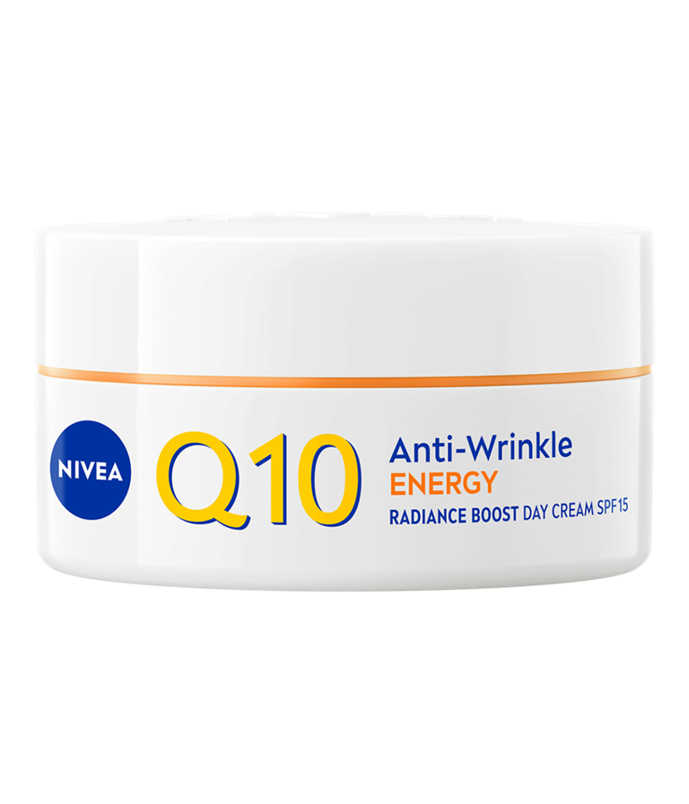 NIVEA Q10 Anti-Wrinkle Energy Instant Radiance Boost Day Cream SK 15 -päivävoide virkistää ihoa ja antaa sille kauniin, terveen hehkun. Samalla se vähentää ja ennaltaehkäisee ryppyjä tehokkaasti.