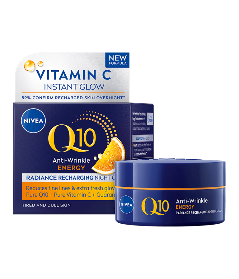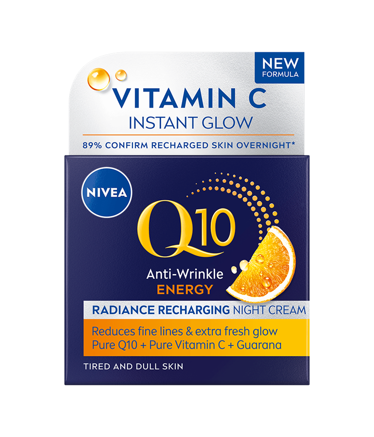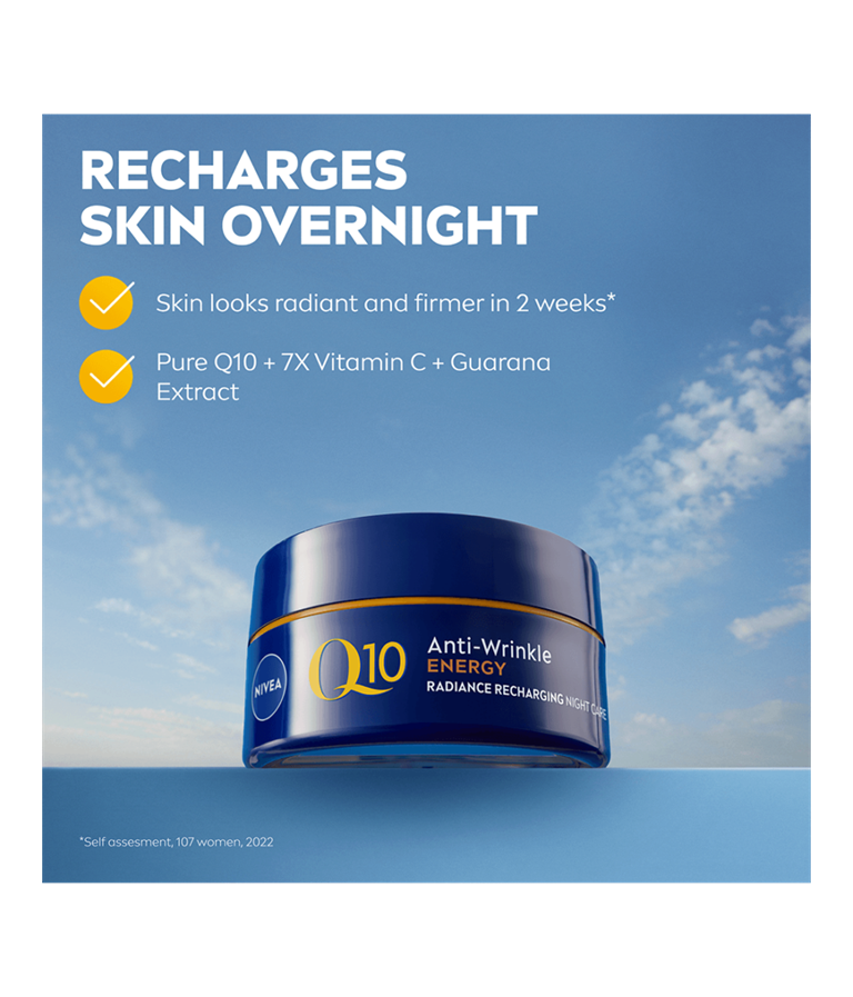 NIVEA Q10 Energy Radiance Recharging Night Cream -yövoide antaa ihosoluille energiaa, korjaa ryppyjä sisältäpäin*, virkistää ihoa tasaisen ja säteilevän,.