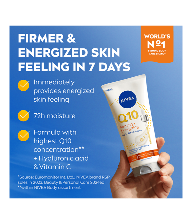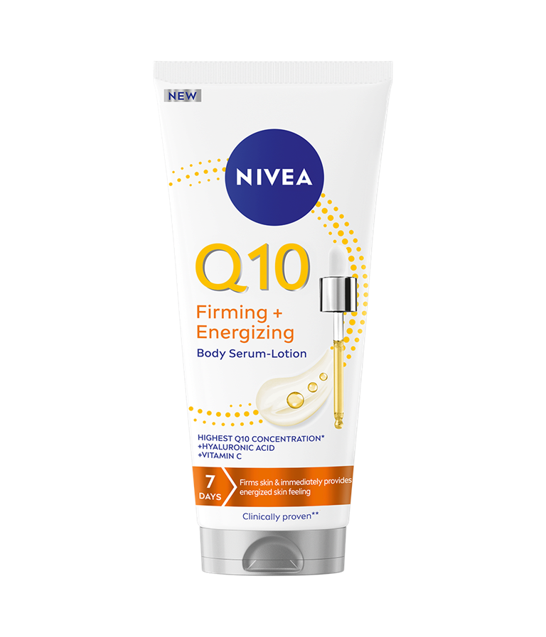NIVEA Q10 Firming & Energizing Body Serum-Lotion -seerumivartalovoide kiinteyttää ihoa vain 7 päivässä ja antaa energiaa iholle sekä kosteuttaa ihoa tehokkaasti 72 tunnin ajan.