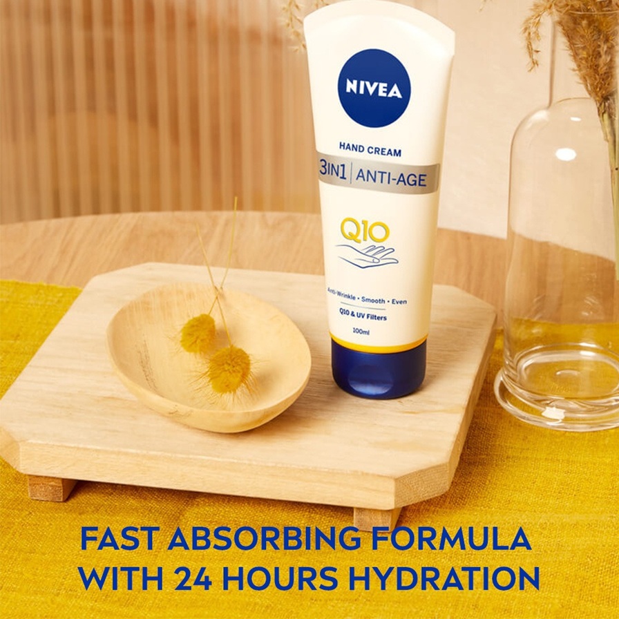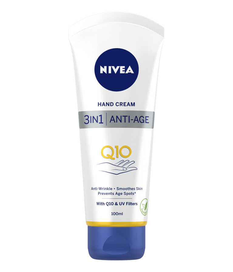 NIVEA Q10 Anti-Age Hand Cream -käsivoide kosteuttaa tehokkaasti kuivia käsiä. Silottaa ja hoitaa ihoa tehokkaasti parantaen ihon pintakerrosten rakennetta.