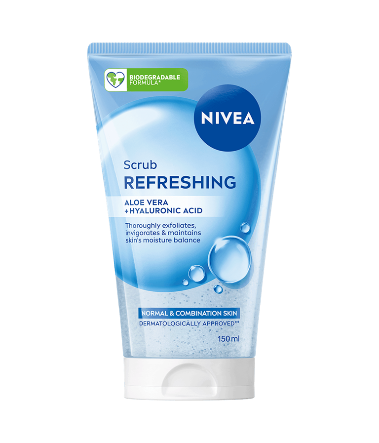 Koe raikastava kuorinta NIVEA Refreshing Scrub -kuorintavoiteella. Se kuorii ihon perusteellisesti, kosteuttaa ihoa ja häivyttää ihohuokosia.