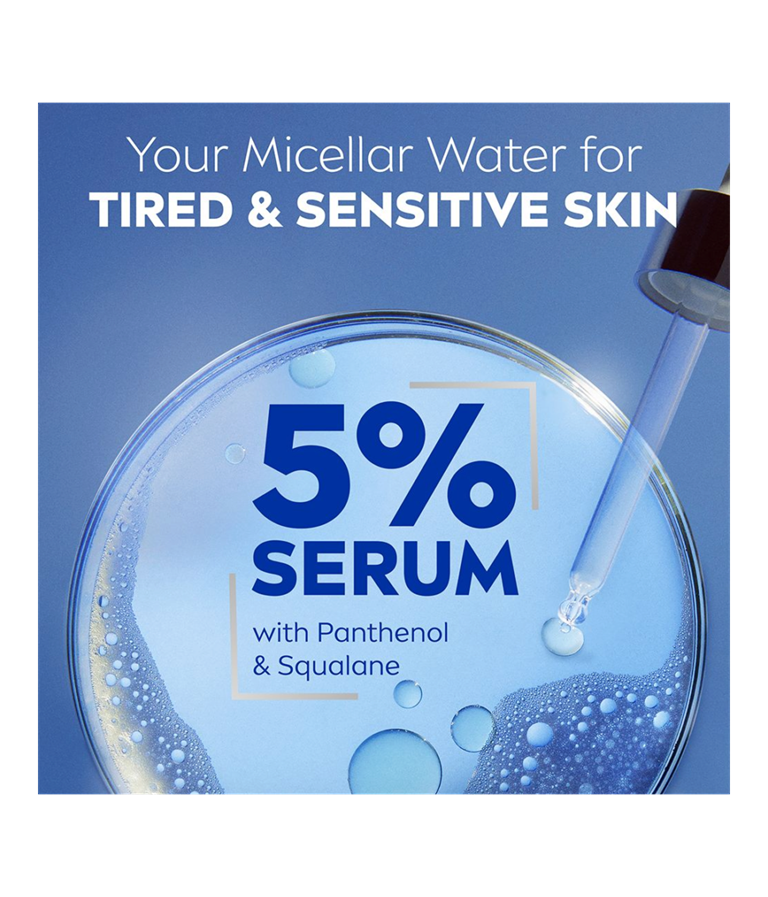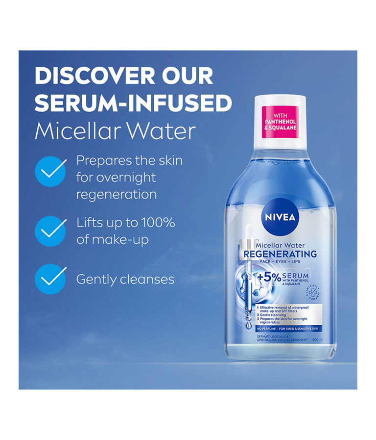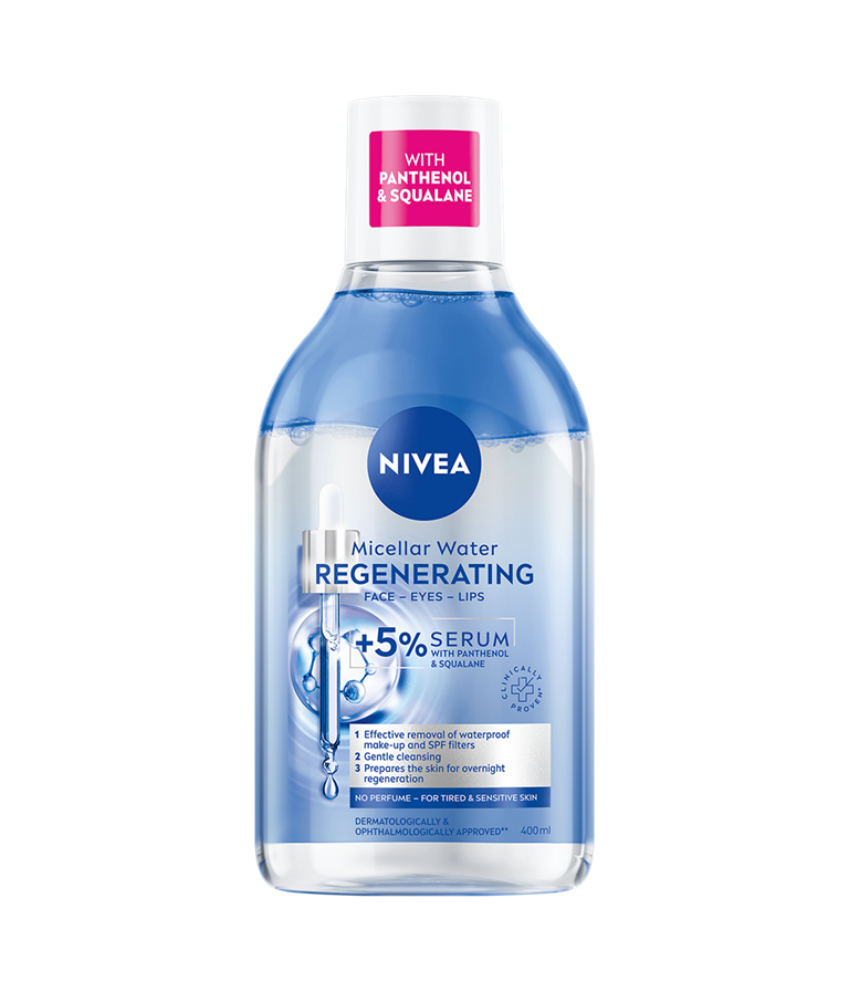 NIVEA Regenerating Micellar Water -misellivesi sisältää 5% seerumia ja aminohappoyhdisteen! Misellivesi poistaa vedenkestävän meikin, epäpuhtaudet ja lian muutamalla kevyellä pyyhkäisyllä, eikä jätä iholle rasvaista tunnetta.