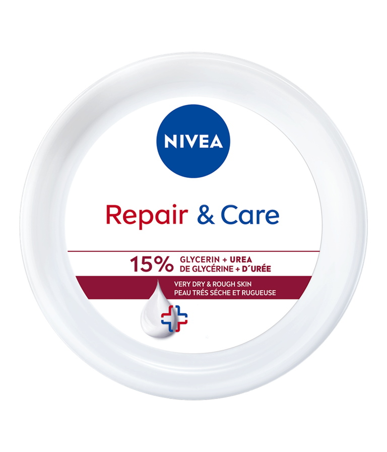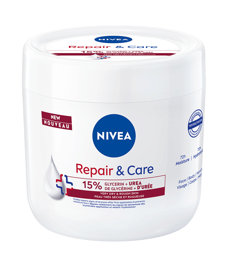 NIVEA Repair & Care -kosteusvoide ravitsee erittäin kuivaa ja karheaa ihoa tehokkaasti. Korjaa kuivuuden näkyviä merkkejä ensimmäisestä käyttökerrasta lähtien ja ehkäisee kosteuden menetystä.